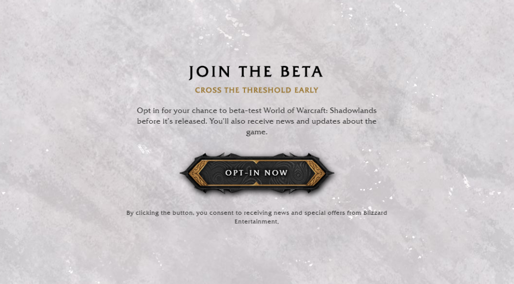 To sign up for the Shadowlands open beta, simply head to the official World of Warcraft: Shadowlands website, log in with your Battle.net account, scroll down to the bottom of the page, and click opt-in now.