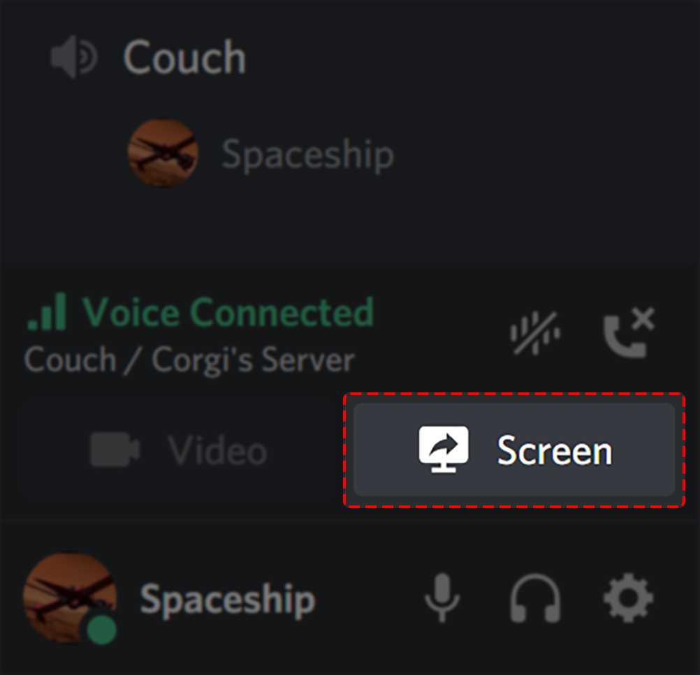 If you’re in a Discord voice channel, you can stream your screen or an application by hitting the “Screen” button next to your voice connection status. This is located at the bottom of the Discord server tab where you can sift through all of a server’s voice and text channels.