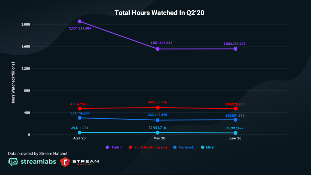 Posting 5.07 billion hours watched, Twitch held a nearly 68-percent share of the market relative to Mixer, YouTube Gaming, and Facebook Gaming. YouTube was the second most-watched platform from April 1 to June 30 with 1.5 billion hours watched, representing 20 percent of the market.