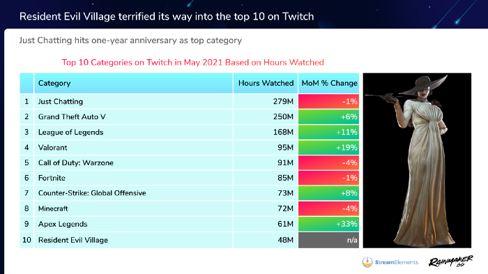 The lack of a major tournament saw Dota 2 drop out of the top 10 games, being replaced by Resident Evil Village, which surged onto the list at 48 million hours watched. Apex Legends also saw a strong increase in May, growing 33 percent overall to 61 million hours watched.