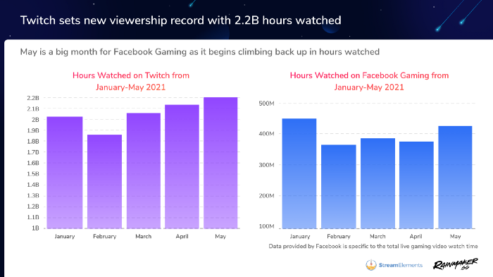 Twitch had its third consecutive month of growth, setting another new record with 2.2 billion hours watched during May, according to Rainmaker.gg, StreamElements’ analytics partner.