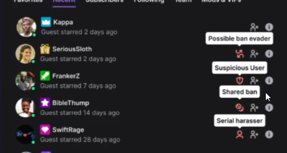 Within the shared ban list, users can label banned users with tags such as “suspicious user” or “serial harasser.” By naming accounts as “possible ban evader,” streamers can help each other avoid users attempting to circumvent channel-specific bans.