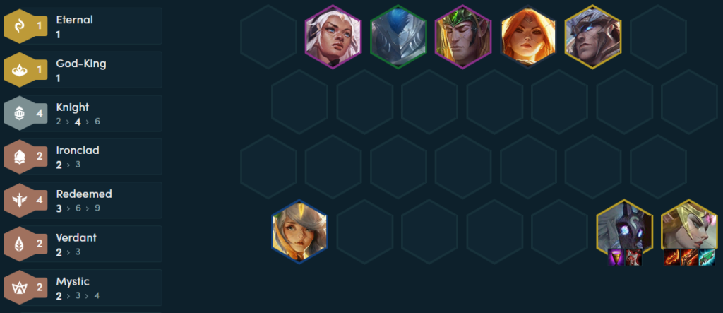 Playing a core of Knight, Ironclad, and Mystic units means your frontline is just about impenetrable. Kayle needs some time to ramp up her spell’s power, so a strong frontline is important.