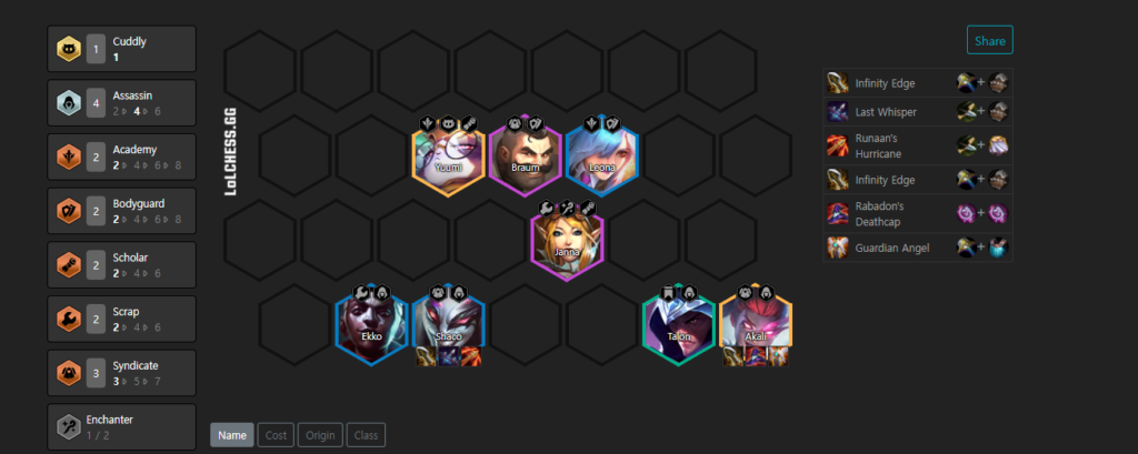 Once the worst Set Six champion, Shaco is thriving within the Syndicate Assassin TFT comp alongside Braum and Akali. It’s a reroll build with a goal of three-starring Shaco. Using Twisted Fate in the early game as a carry maintains health. And a three-star Shaco can tear an enemy’s team apart with items like Last Whisper, Runnan’s Hurricane, and Infinity Edge. Depending on the lobby meta, players should consider Quicksilver as a third item option.