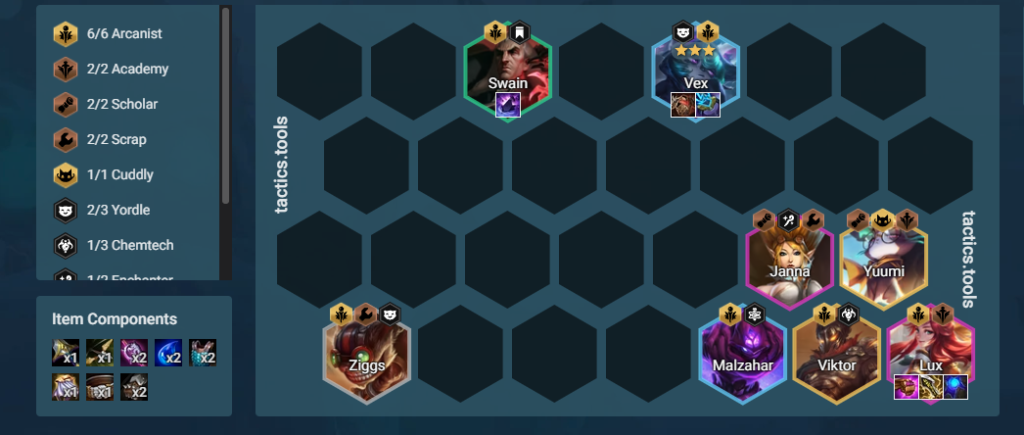 Vex, Taric, and Swain support and protect Lux on the frontline. Viktor is a solid addition to the comp during the late game stages, equipped with items like Blue Buff and Spear of Shojin to speed up his casting time. Vex is the preferred secondary carry with defensive items. A healing Hextech Augment like Celestial or Thrill of the Hunt can improve the TFT comp.