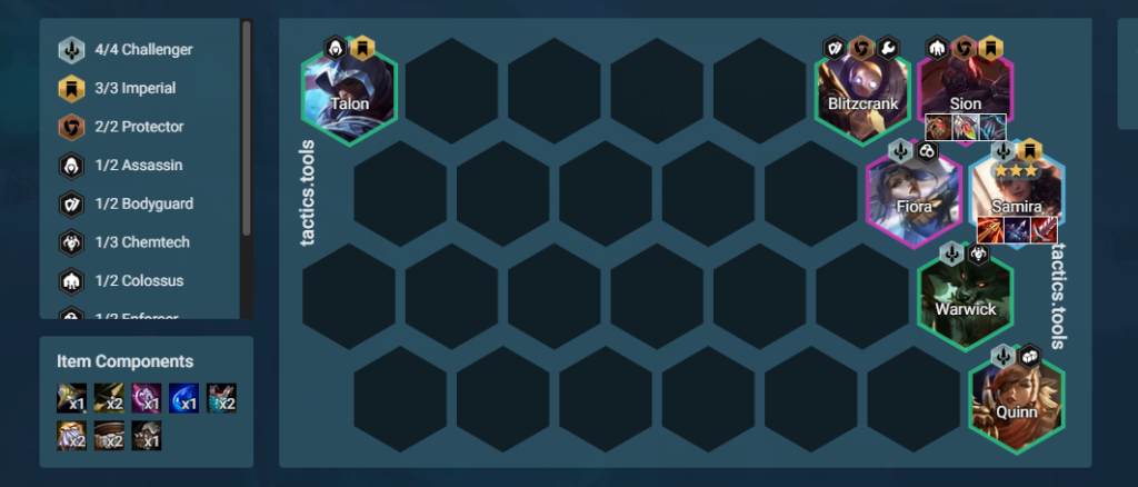 Samira has typically performed best with four Challenger but is on the rise within the Imperial reroll TFT comp. Players can easily transition to a Challenger build, or a Talon reroll, providing a good amount of flexibility. The ideal items on Samira are Blood Thirster, Last Whisper, and Runnan’s Hurricane. But don’t miss out on potentially placing an Assassin emblem on Samira.