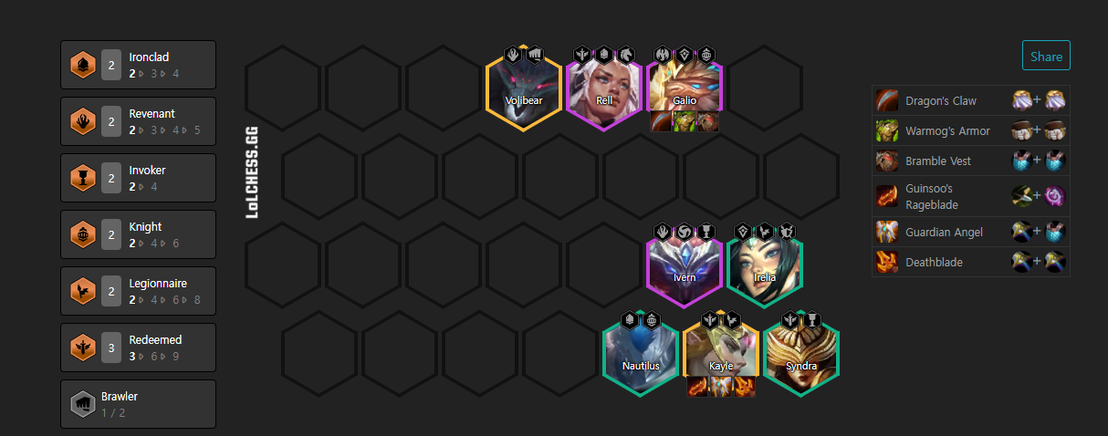 Defensive items can go on Galio, Rell, Volibear, and Ivern. Dragon Claw and Warmog’s Armor are recommended, along with Redemption and Bramble Vest.