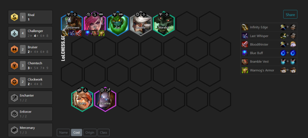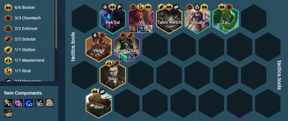 Morellonomicon increases the burn and poison damage pumped out by Renata, while Hextech Gunblade heals her, and Blue Buff can have her cast even faster given she has a starting mana of 0/60. Adding Silco in during the late game can have the same effect if you can’t make a Blue Buff. The Bruiser build consists of Vi as the secondary carry with items like Bramble Vest, Dragons Claw, and Redemption. The rest of the Bruiser team is Zac, Sejuani, Rek’Sai, Illaoi, and Tahm Kench.