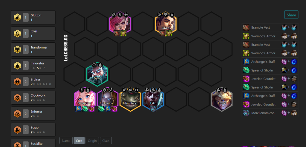 The Innovator build is a flexible best TFT comp that can use either Seraphine or Irelia as the primary carry. Seraphine’s best Set 6.5 items are a Spear of Shojin to increase the number of times she casts her spell, Morellonomicon, and Deathcap. Players will want Tahm Kench and Vi as a final Bruiser front line while running Ezreal and Ekko for Scrap, creating a strong board presence during the early game.