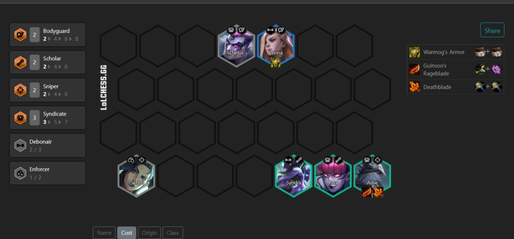 Draven, Leona, and Syndra are the three Debonair Set 6.5 champions players will want in the Debonair comp. Braum paired with Leona helps establish a solid frontline while stalling enemy teams with his crowd control effects. Camille is a good early game Challenger unit that also synergizes with Orianna during the late game via Clockwork. And adding Morgana and Zyra can synergize the Debonair comp further via the Scholar and Syndicate traits getting activated.