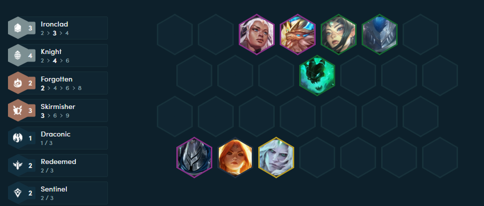 A Jax and four Knights comp is climbing the tier status ranks, according to TFTRen. Jax pops off with three skirmisher champions while four of the Knight trait stand guard on the frontline. The best-in-slot items for Jax are still Bloodthirster and Runnan’s Hurricane. Last Whisper is a strong third item option, along with Hand of Justice.