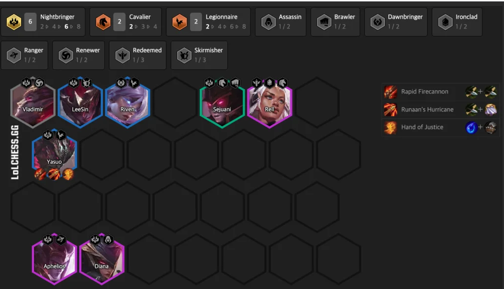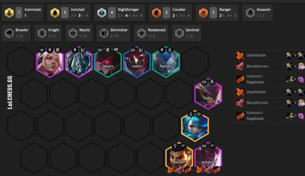 Aphelios has returned to the top of the TFT meta thanks to new Set 5.5 champions Akshan and Gwen. Both Aphelios and Akshan pop off the most with AD items like Deathblade and Bloodthirster, according to Bunnymuffins. Four Nightbringer is a must, using champions like Lee Sin, Diana, and Sejuani. Rell is a solid second Cavalier who also attributes to three Ironclad in conjunction with Jax and Natilus.
