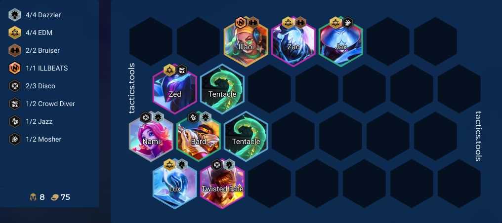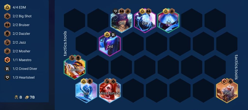 If you go with Zed or Zac as your EDM sampler, you have the opportunity to focus more on other units that you can fit alongside EDM. Considering how EDM will make Zac tankier or Zed more powerful, either way you’ll have a stronger frontline, so you can add some different backline traits, and my personal favorite is Jazz. Get a Sett to activate Mosher with Jax and Bruiser with Zac, and try to get a Miss Fortune alongside a Bard, and you already have six traits active. Then, try and build Bard over Lux, as he can keep your tanks alive stupidly long over the course of later combat rounds.