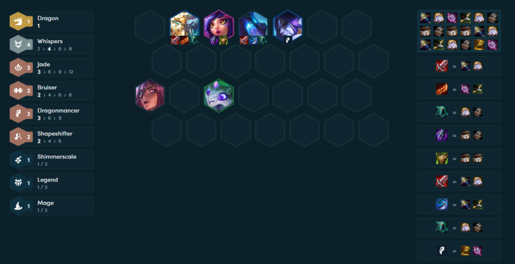 Whispers also synergize well with the Dragonmancer trait in TFT Set Seven, requiring a Dragonmancer spatula. Either Sy’fen or Sylas can hold the Dragonmancer Spatula/emblem. And either Volibear or Sy’fen can get used as the primary carrier. In conjunction with three Jade units, both Sy’fen and Volibear can rip apart an opponent’s board. Karma, Ashe, and Volibear can activate the Dragonmancer trait during the early game. Neeko and Gnar are solid late-game Jade units while Sylas and Sy’fen activate four Whispers.