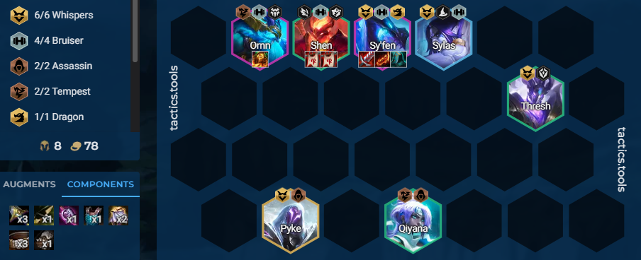 The most traditional Sy’fen Set Seven comp uses six Whispers units and four Bruisers. Yone is a solid early game carrier for Sy’fen, synergizing with Shen via Warrior. Thresh and Leona are also good opening units depending on what the Mirage sub-trait is. Either Thresh or Elise can get replaced during the late game with Pyke. The core Bruiser units are Sy’fen, Sylas, Ornn, and Shen. And Qiyana sticks around to synergize with Pyke and Ornn.