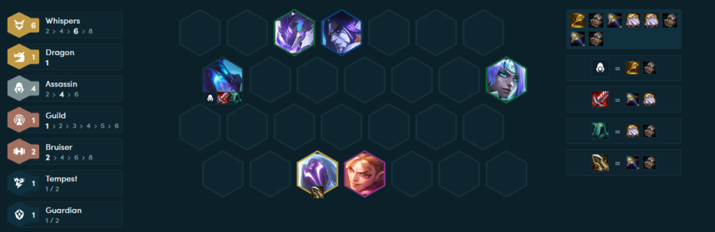The Assassin Whispers TFT Set Seven comp still uses Sy’fen as a main carry but takes up an item slot with an Assassin Spatula or emblem. It’s the most efficient build during the early and mid-game stages until players hit level seven and find a Sy’fen in the shop. Any AD carry can hold items for Sy’fen. Elise can also hold items as she’s strong during the Mid-game but falls off hard during the late game stages. The four Assassin units during the late game are Sy’fen, Pyke, Qiyana, and Talon. Qiyana activates the Tempest trait with Ornn on the battlefield and Talon provides additional attack damage via the Guild trait.