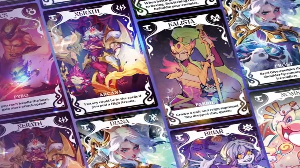 Each tarot card has the TFT symbol in the top left corner, while the trait symbol is on the far top right. The names of champions are in a banner at the top with a full art image below, the name of the trait, and text that taps into the flavor of Magic n’ Mayhem. Some of the champions on tarot cards revealed so far include Diana, Gwen, Nomsy, Camille, Varus, Morgana, Xerath, Kalista, Norra/Yuumi, and Briar.