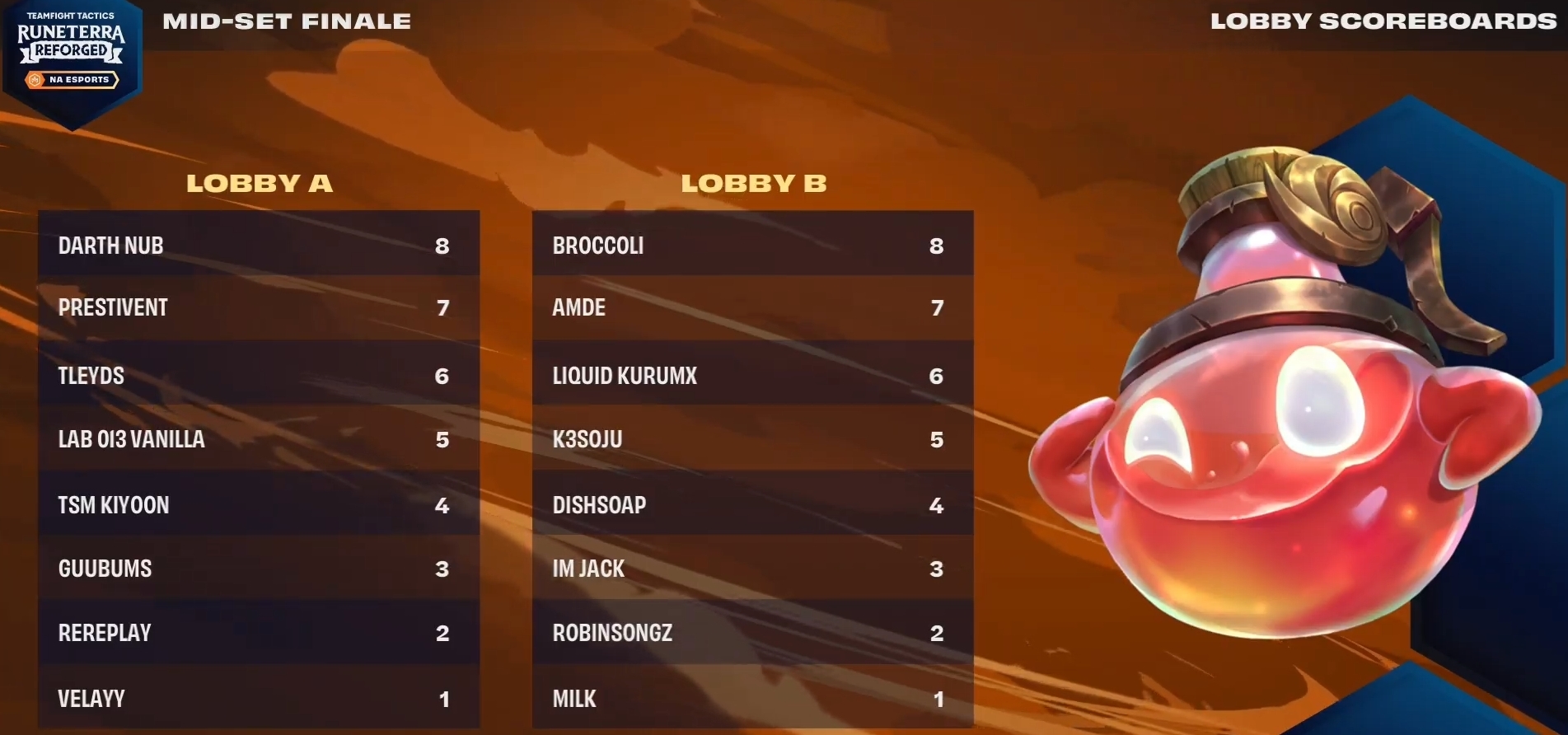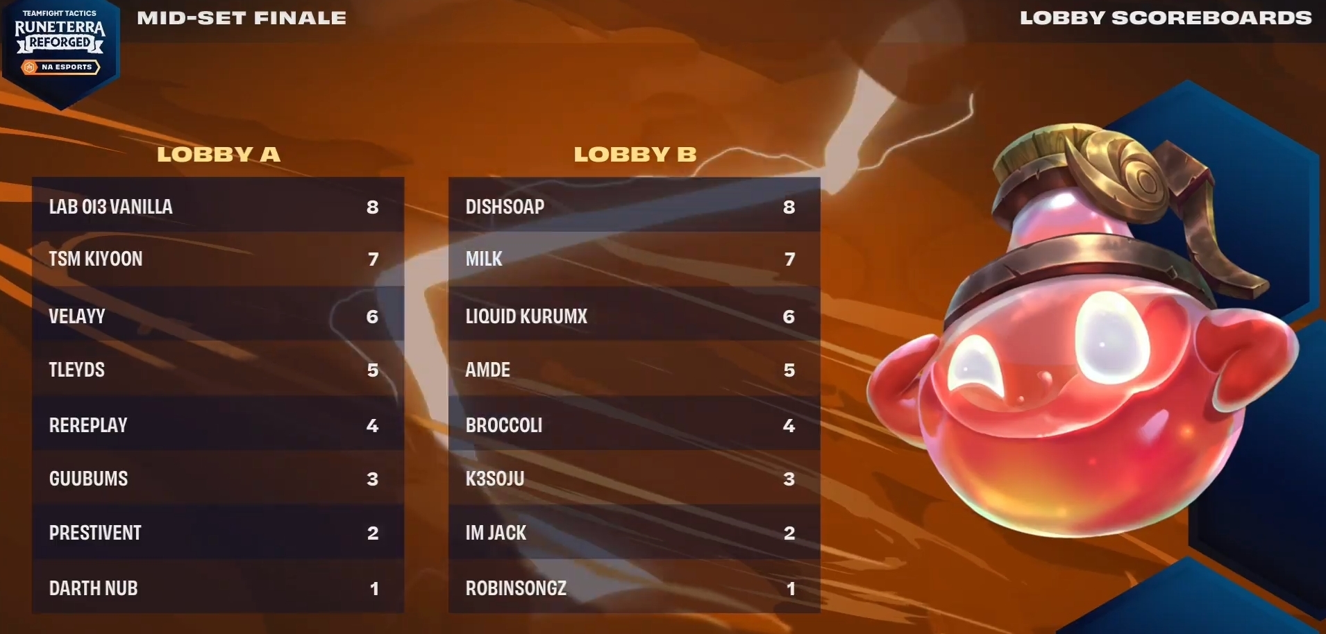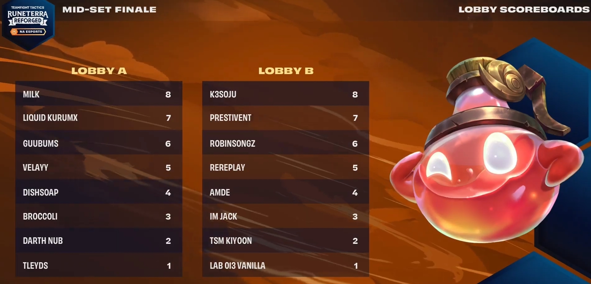 A third-place lobby finish was enough to push Milk into the top 16 after sitting on the bubble after five games with 23 points. Just missing the cut was OPS Appies at 27 points, losing the tie-breaker to Guubums. A game six lobby win propelled TL Robinsongz to third place overall with 34 points, one point behind Rereplay in second, and three points behind Tleyds who finished the day in first. The top six players earned bonus points heading into day two of the TFT Set Nine NA Mid-Set Finale.