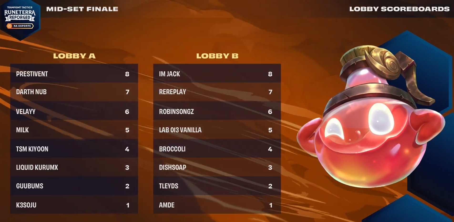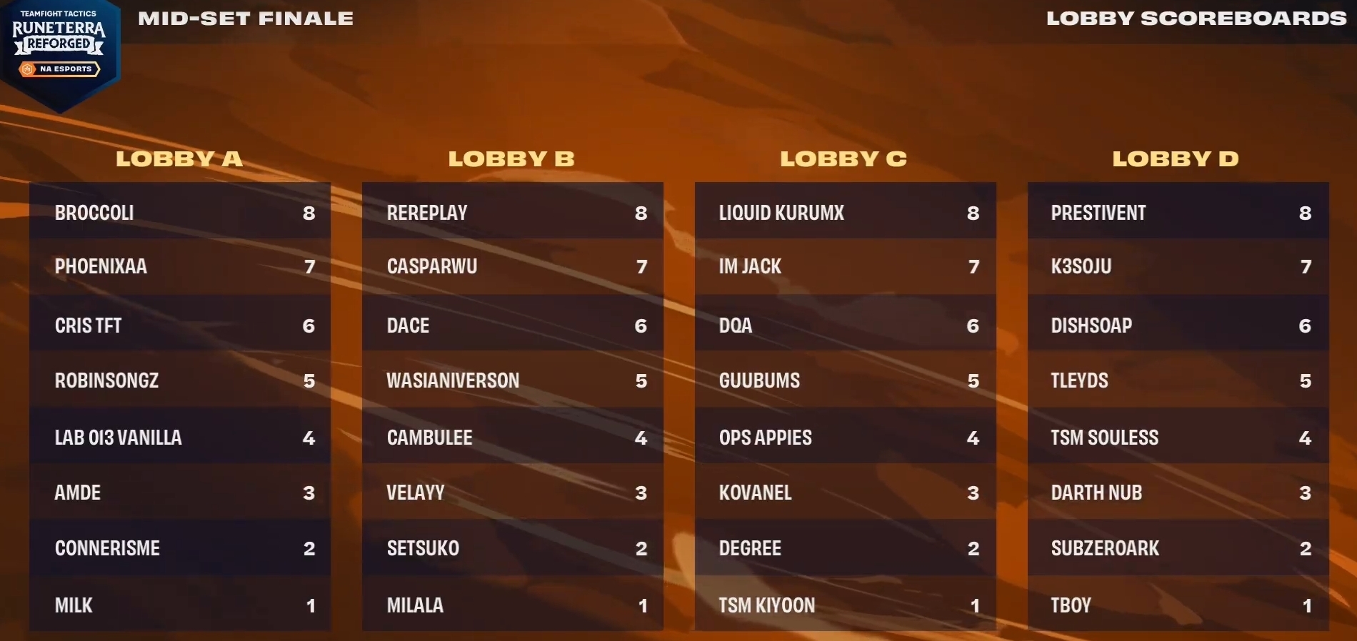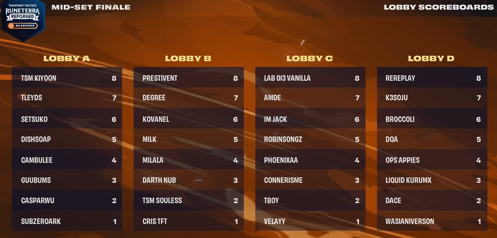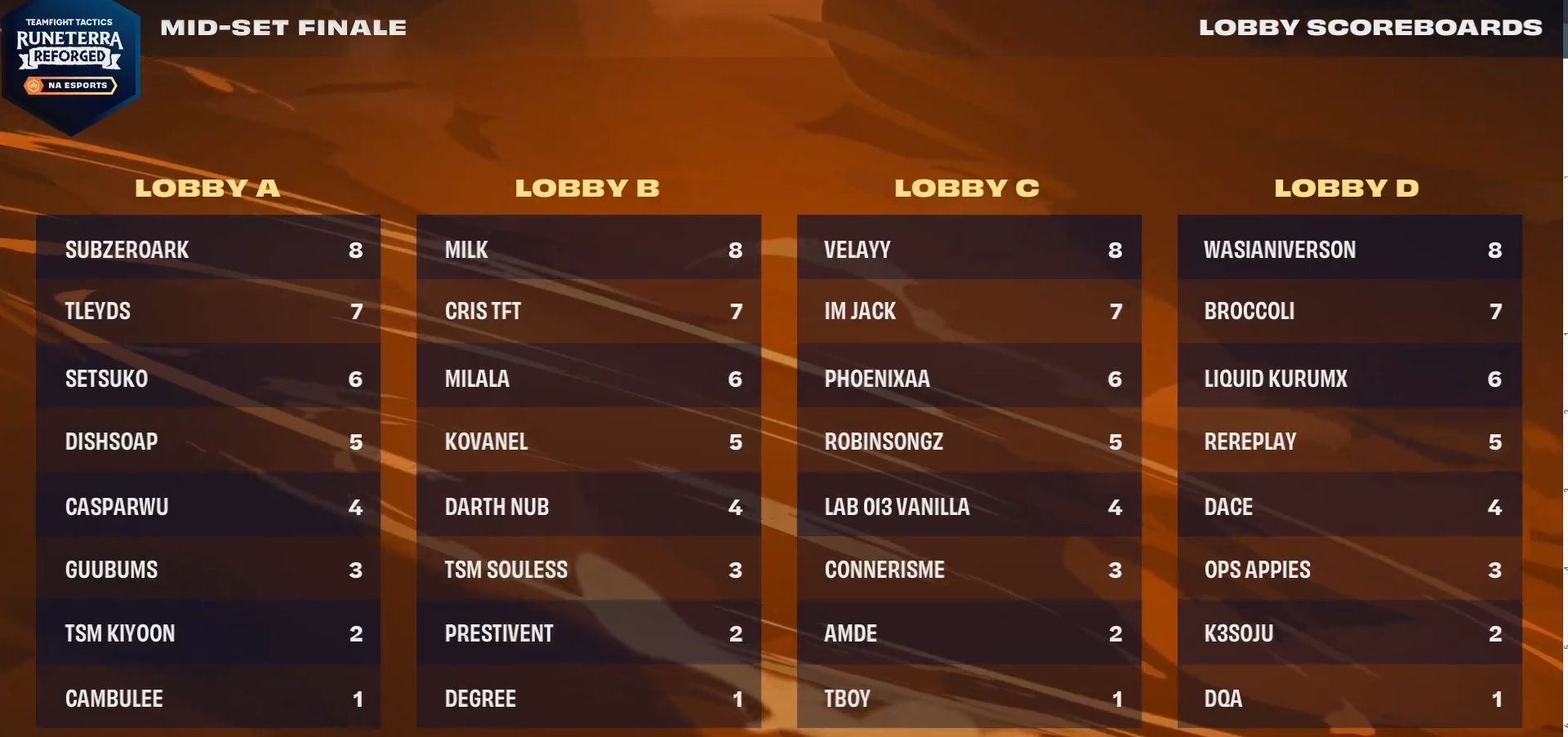 A third-place lobby finish was enough to push Milk into the top 16 after sitting on the bubble after five games with 23 points. Just missing the cut was OPS Appies at 27 points, losing the tie-breaker to Guubums. A game six lobby win propelled TL Robinsongz to third place overall with 34 points, one point behind Rereplay in second, and three points behind Tleyds who finished the day in first. The top six players earned bonus points heading into day two of the TFT Set Nine NA Mid-Set Finale.
