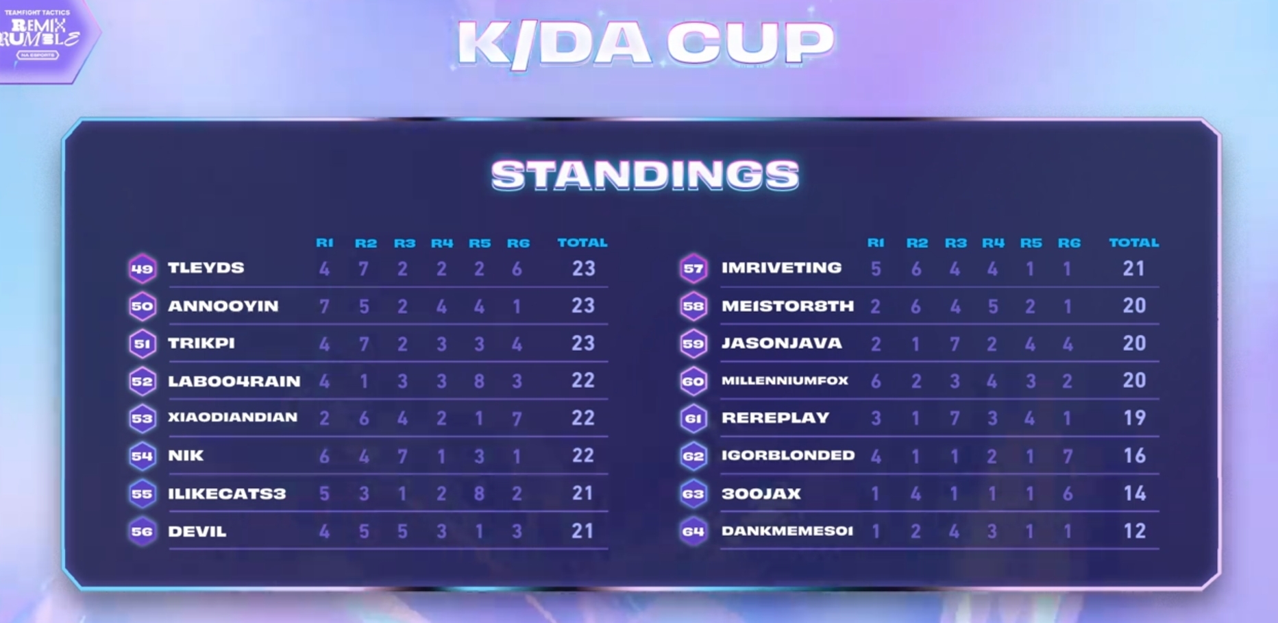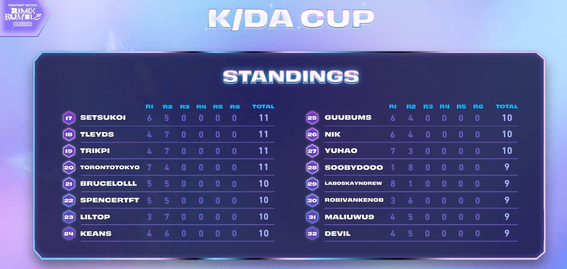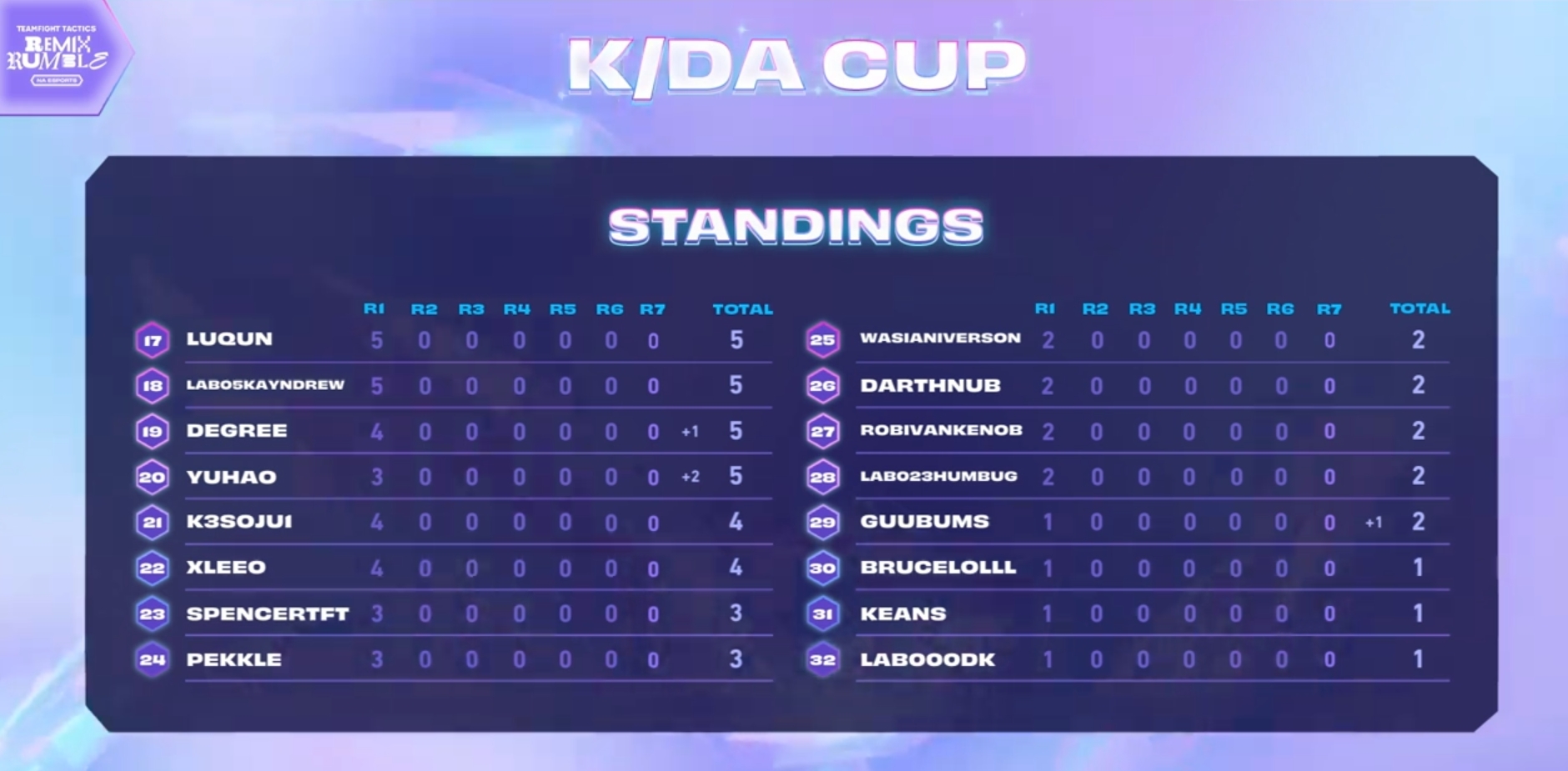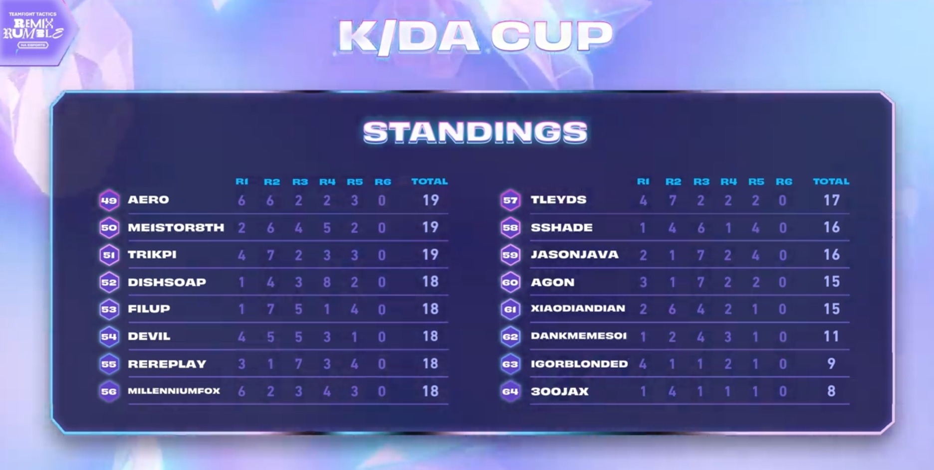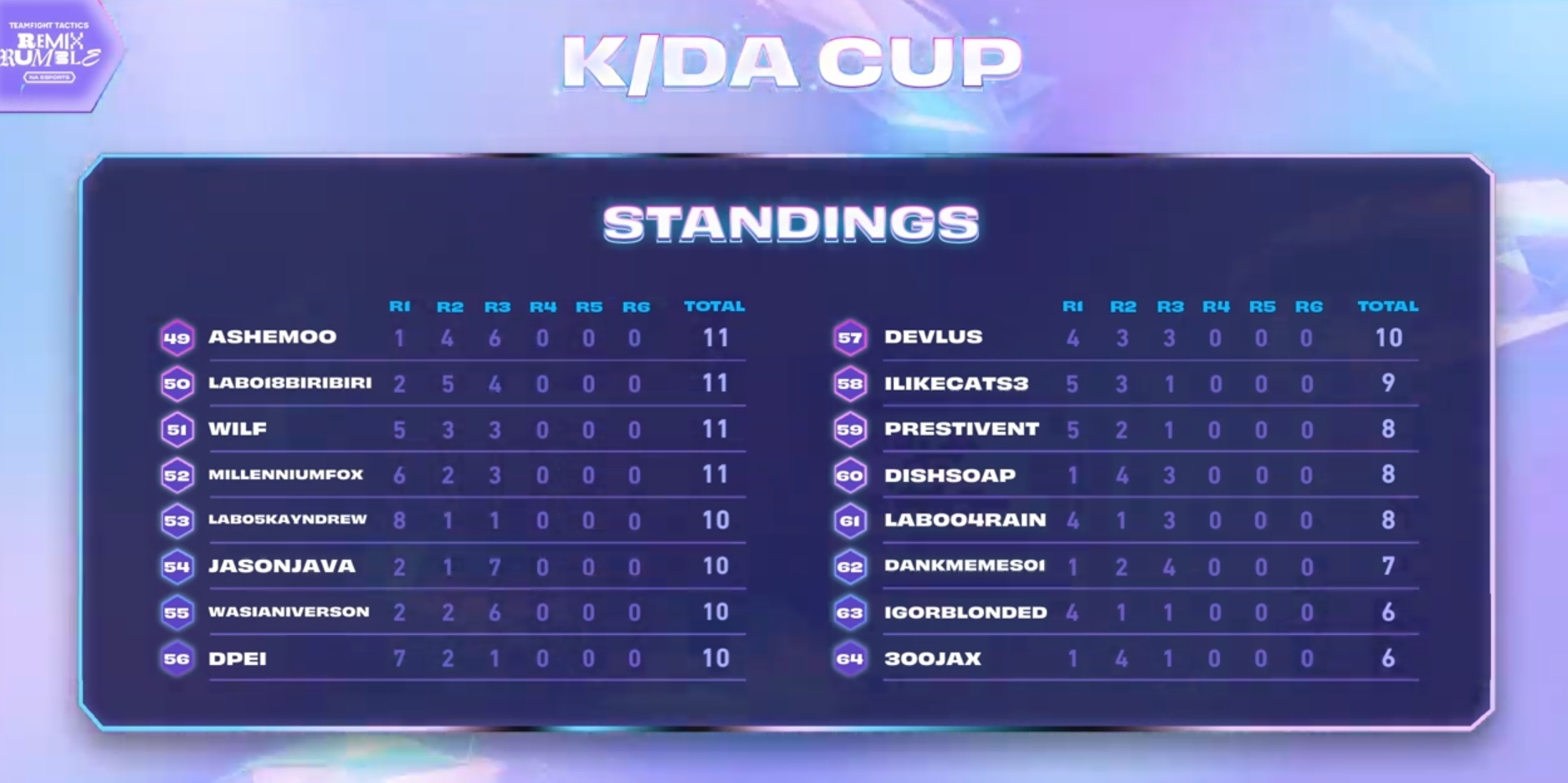 The final two days of the NA K/DA Cup were played on Patch 14.1. All 32 players who advanced from the first weekend joined the 32 TFT players with a bye on day three, playing a total of six rounds. Only 32 of the total 64 advanced onto the final day of the Remix Rumble K/DA Cup.