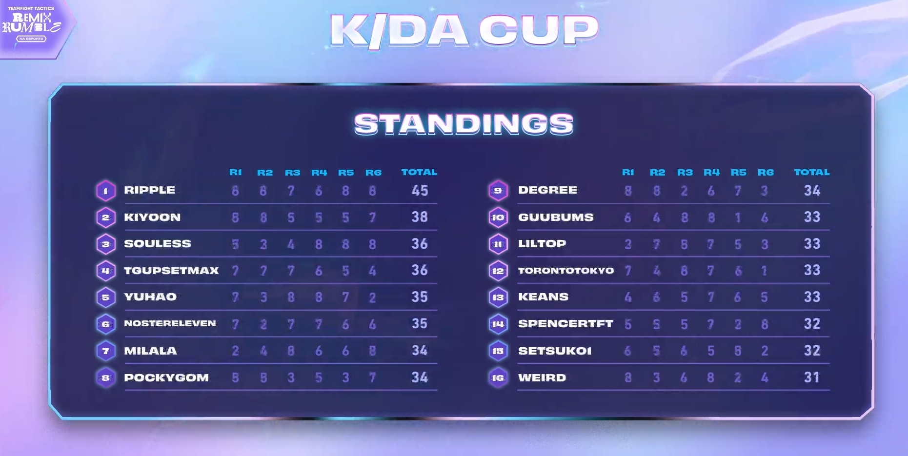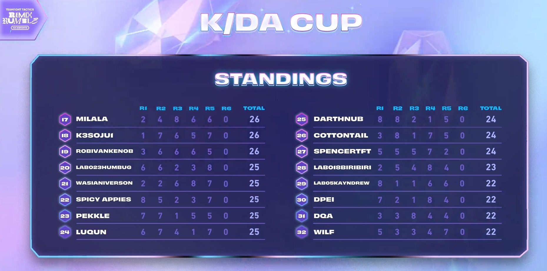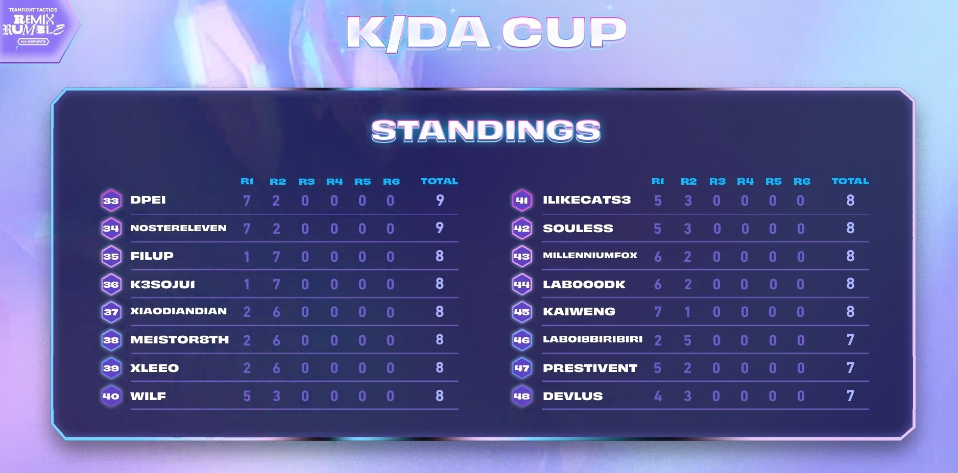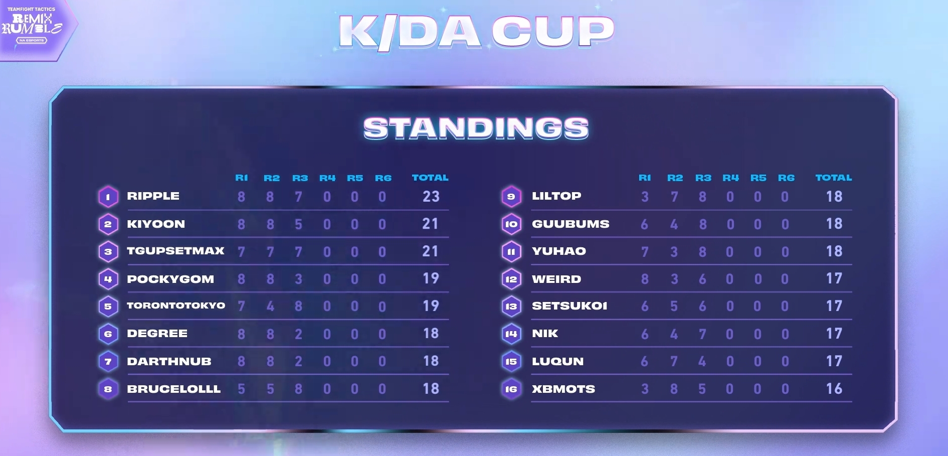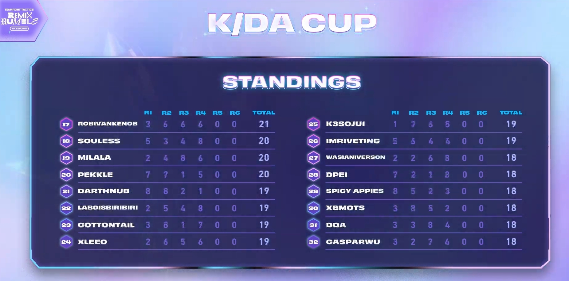 The final two days of the NA K/DA Cup were played on Patch 14.1. All 32 players who advanced from the first weekend joined the 32 TFT players with a bye on day three, playing a total of six rounds. Only 32 of the total 64 advanced onto the final day of the Remix Rumble K/DA Cup.