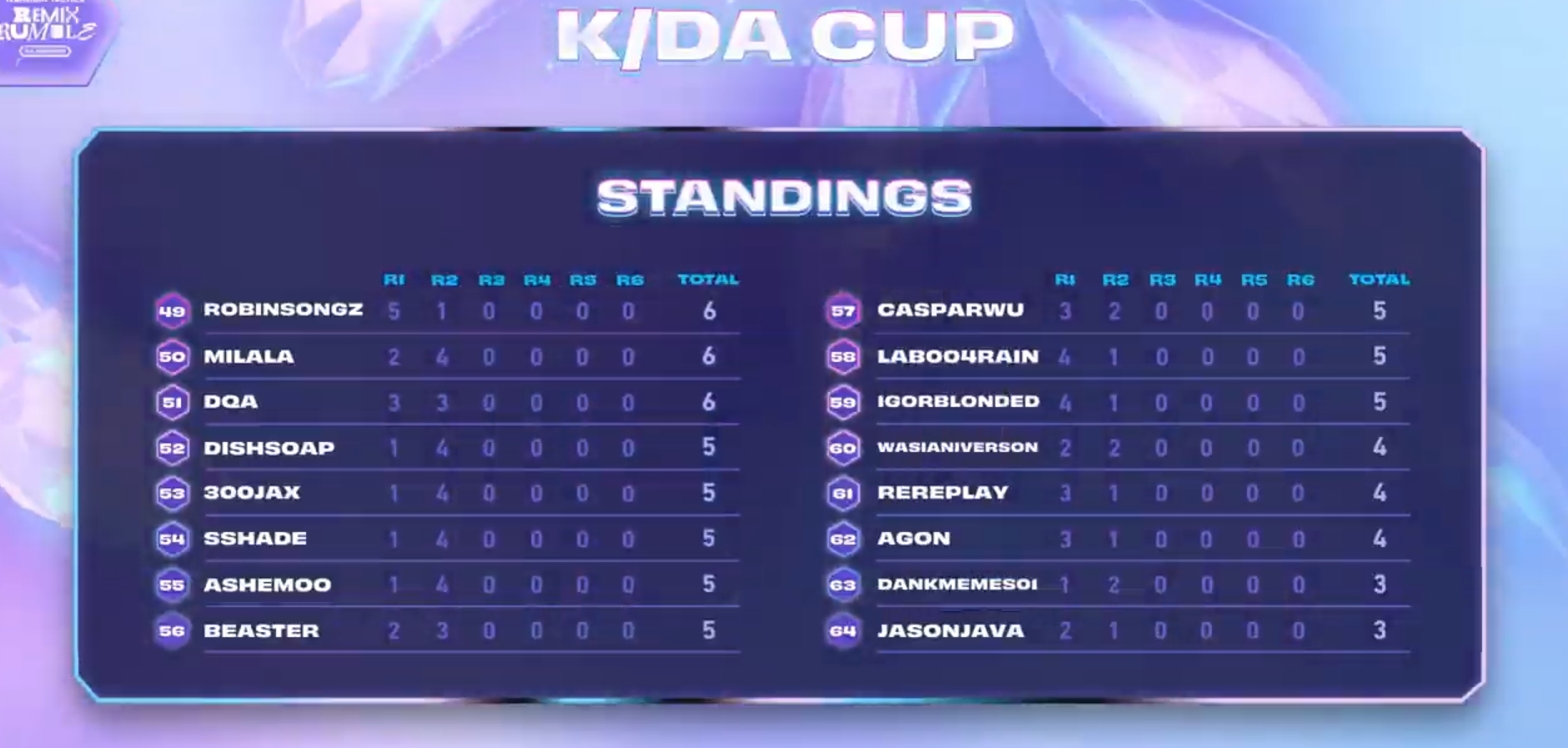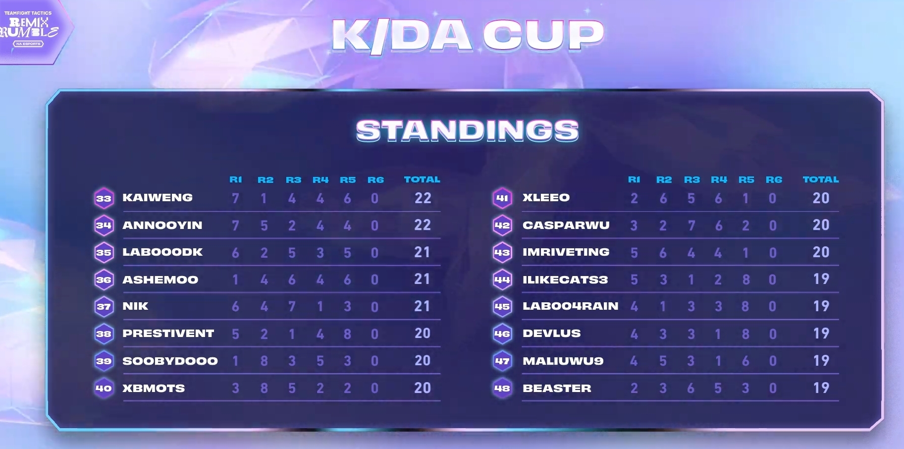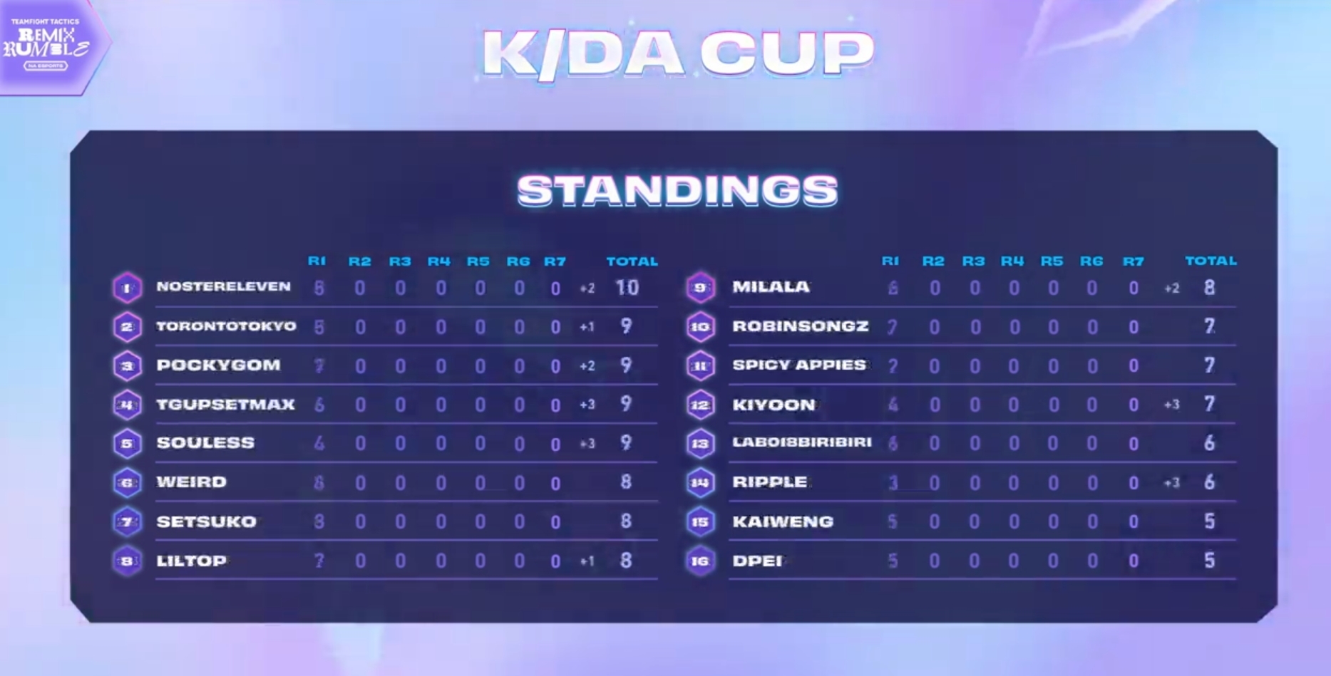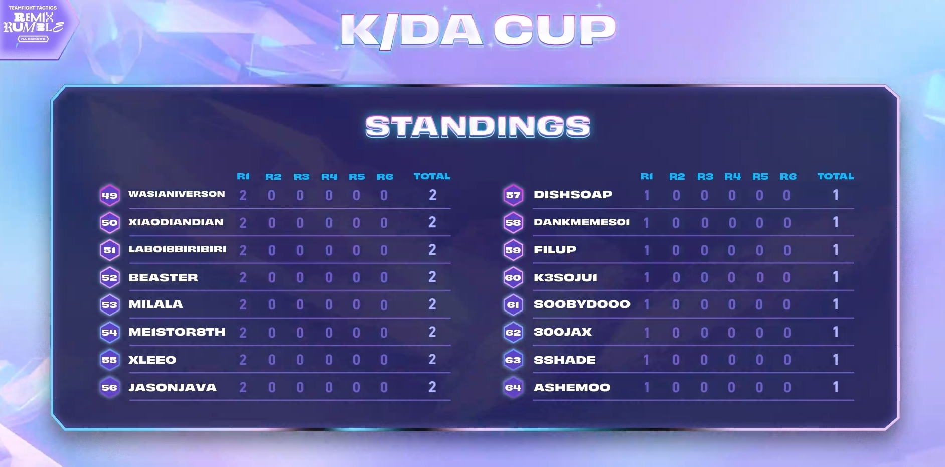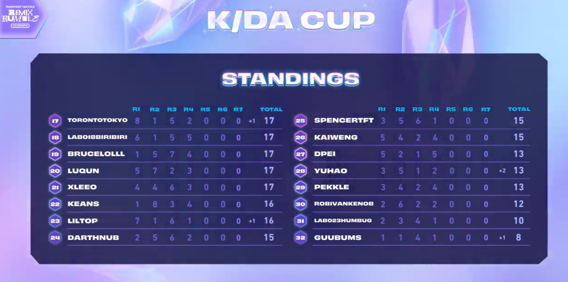 The final two days of the NA K/DA Cup were played on Patch 14.1. All 32 players who advanced from the first weekend joined the 32 TFT players with a bye on day three, playing a total of six rounds. Only 32 of the total 64 advanced onto the final day of the Remix Rumble K/DA Cup.