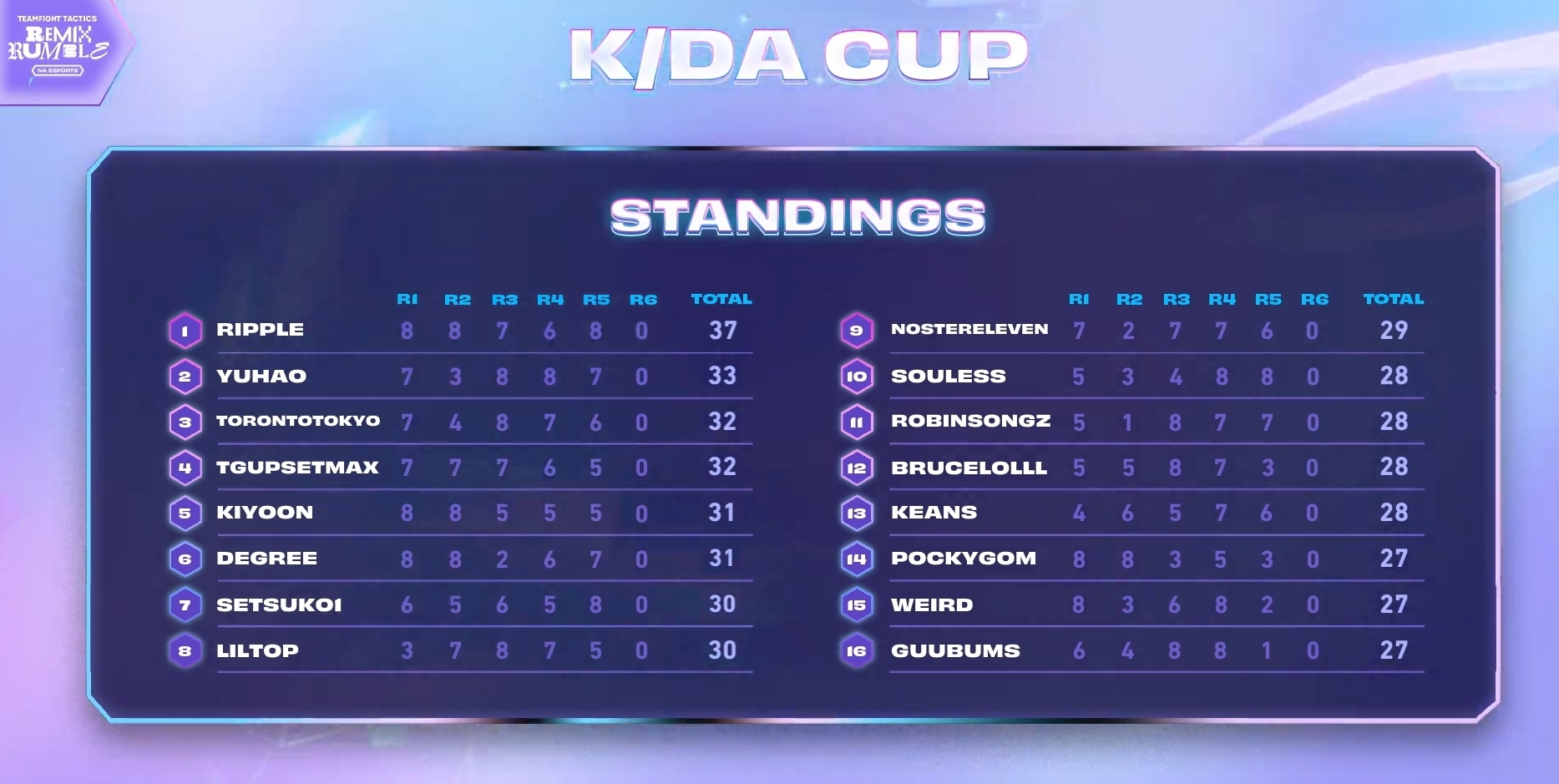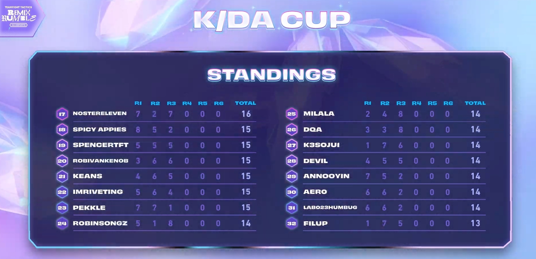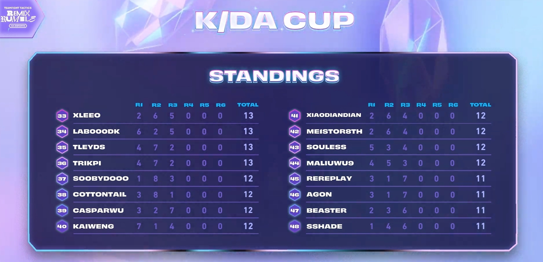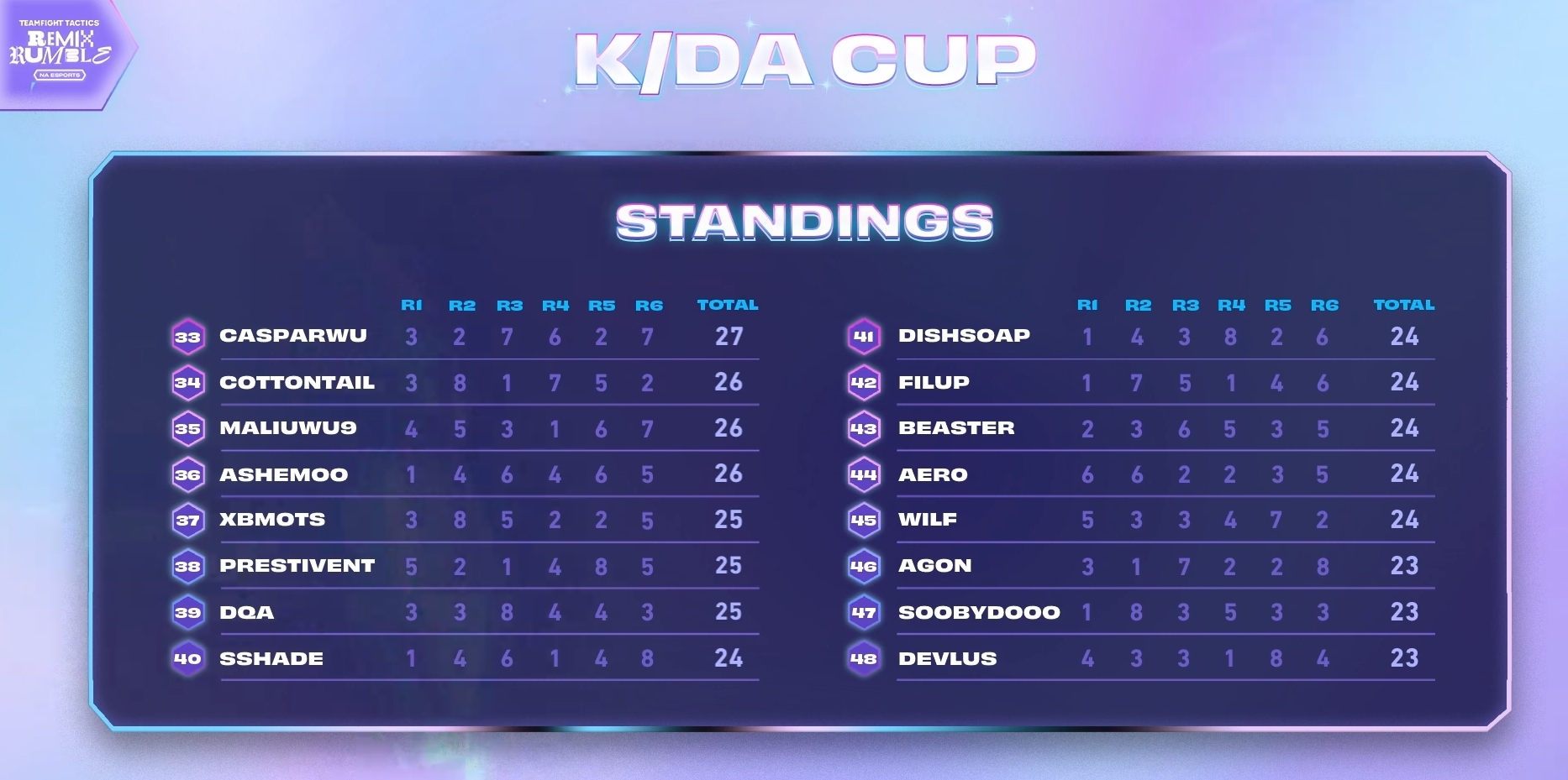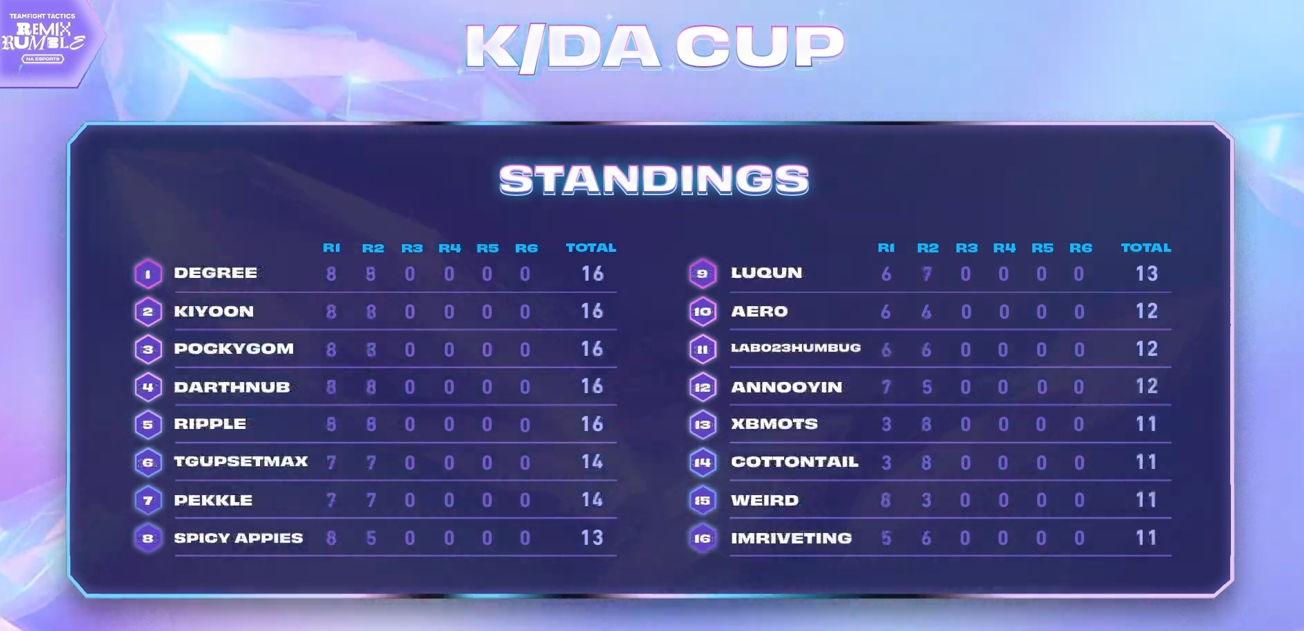 The final two days of the NA K/DA Cup were played on Patch 14.1. All 32 players who advanced from the first weekend joined the 32 TFT players with a bye on day three, playing a total of six rounds. Only 32 of the total 64 advanced onto the final day of the Remix Rumble K/DA Cup.