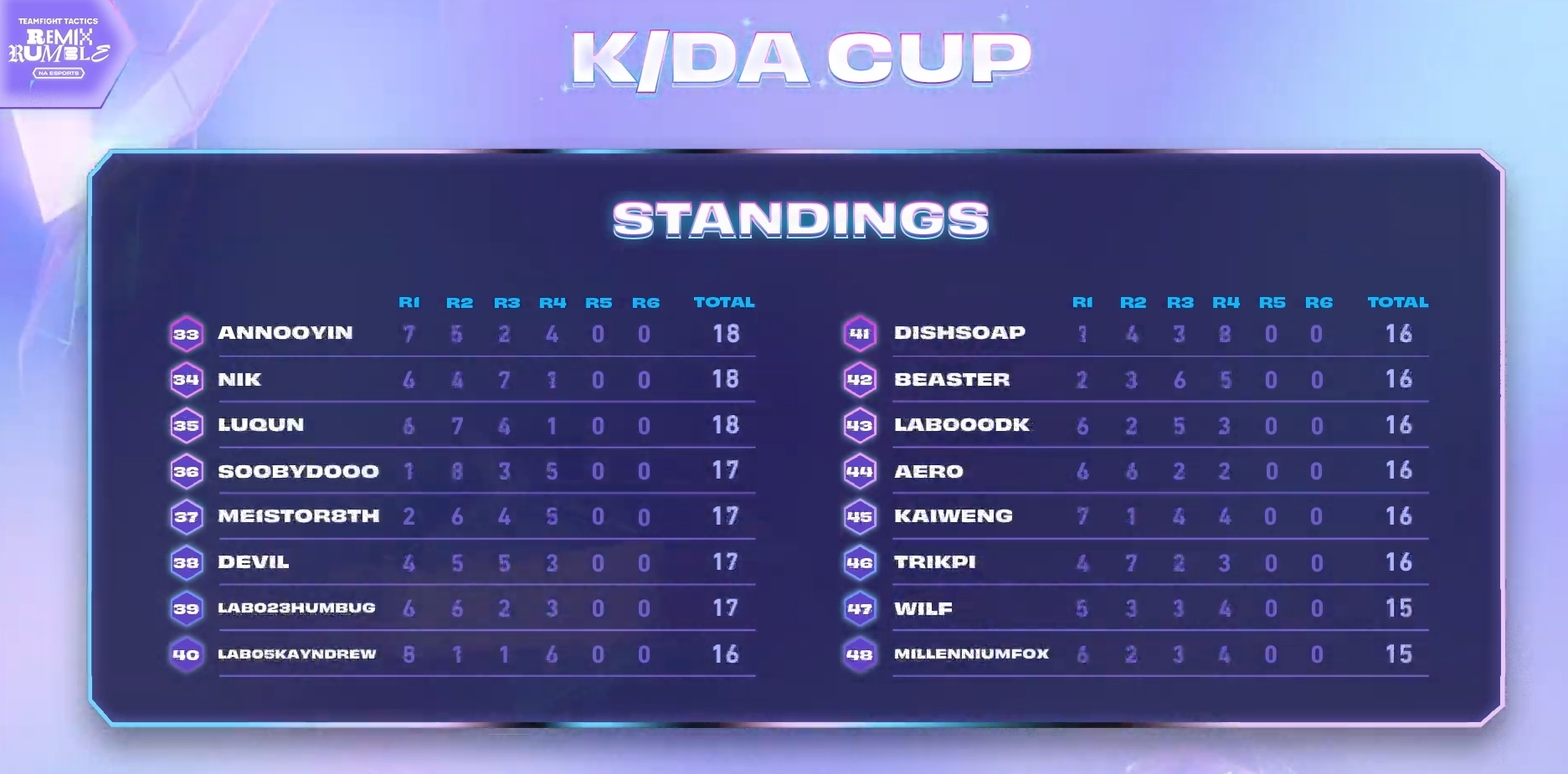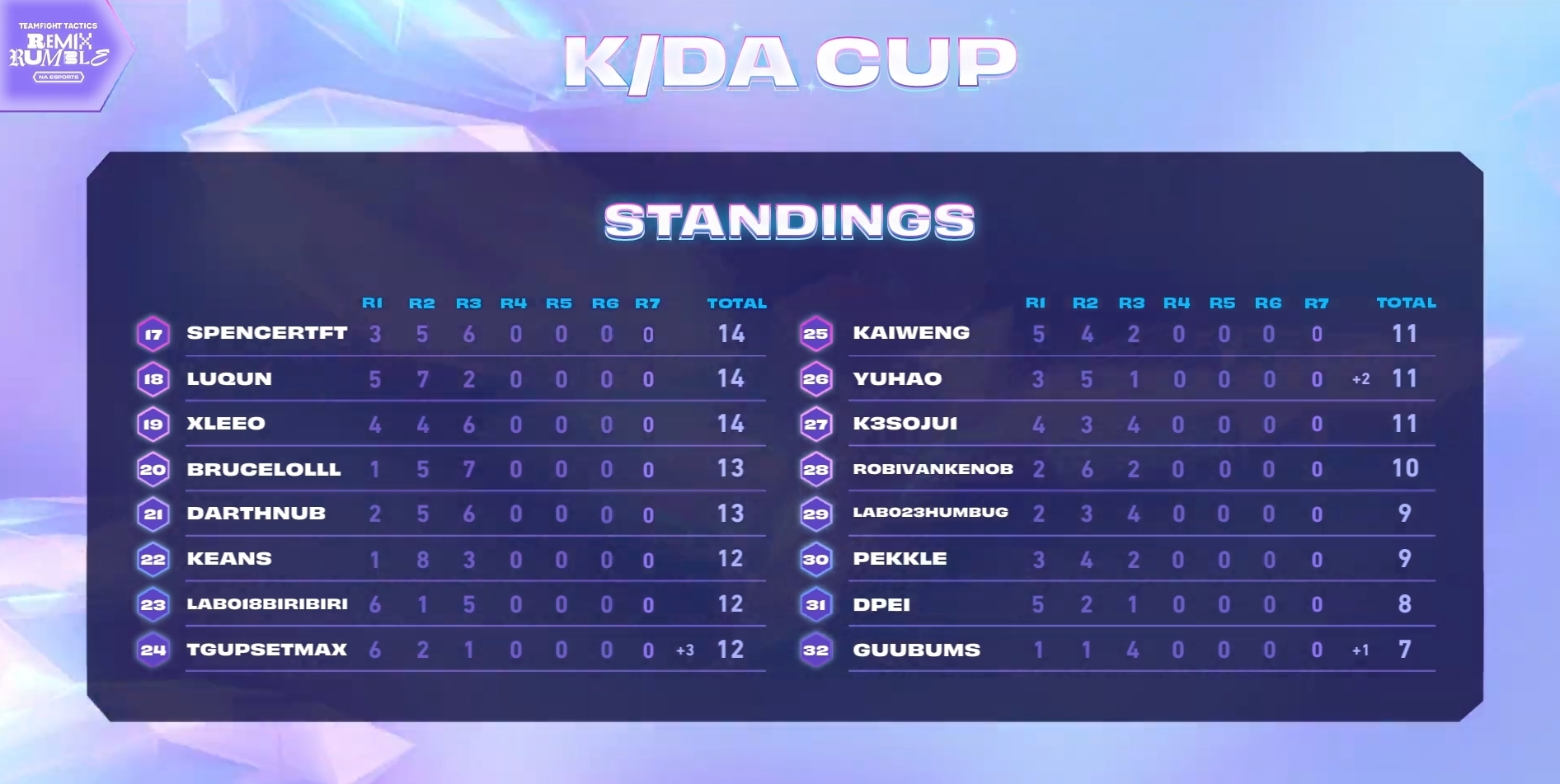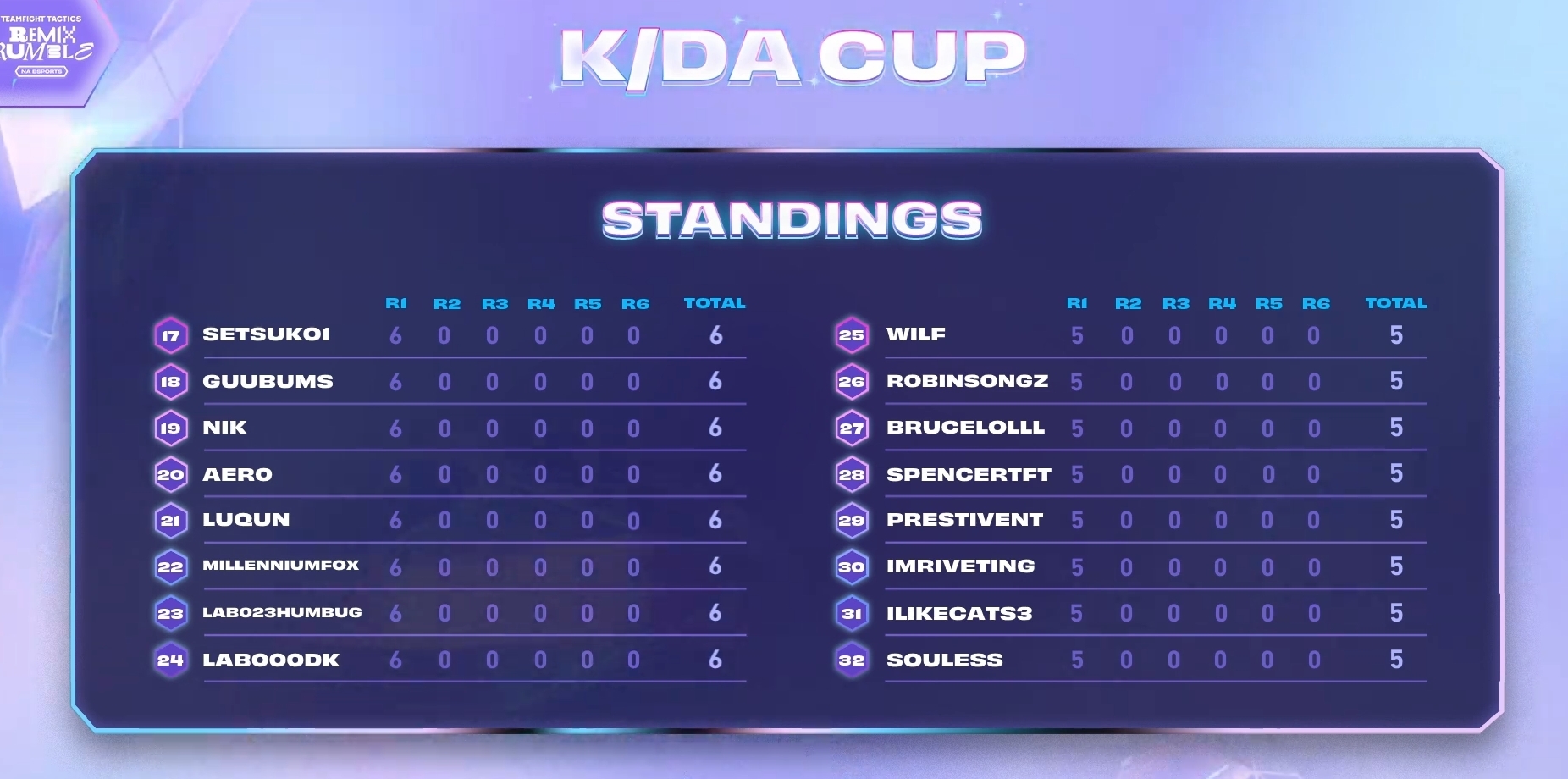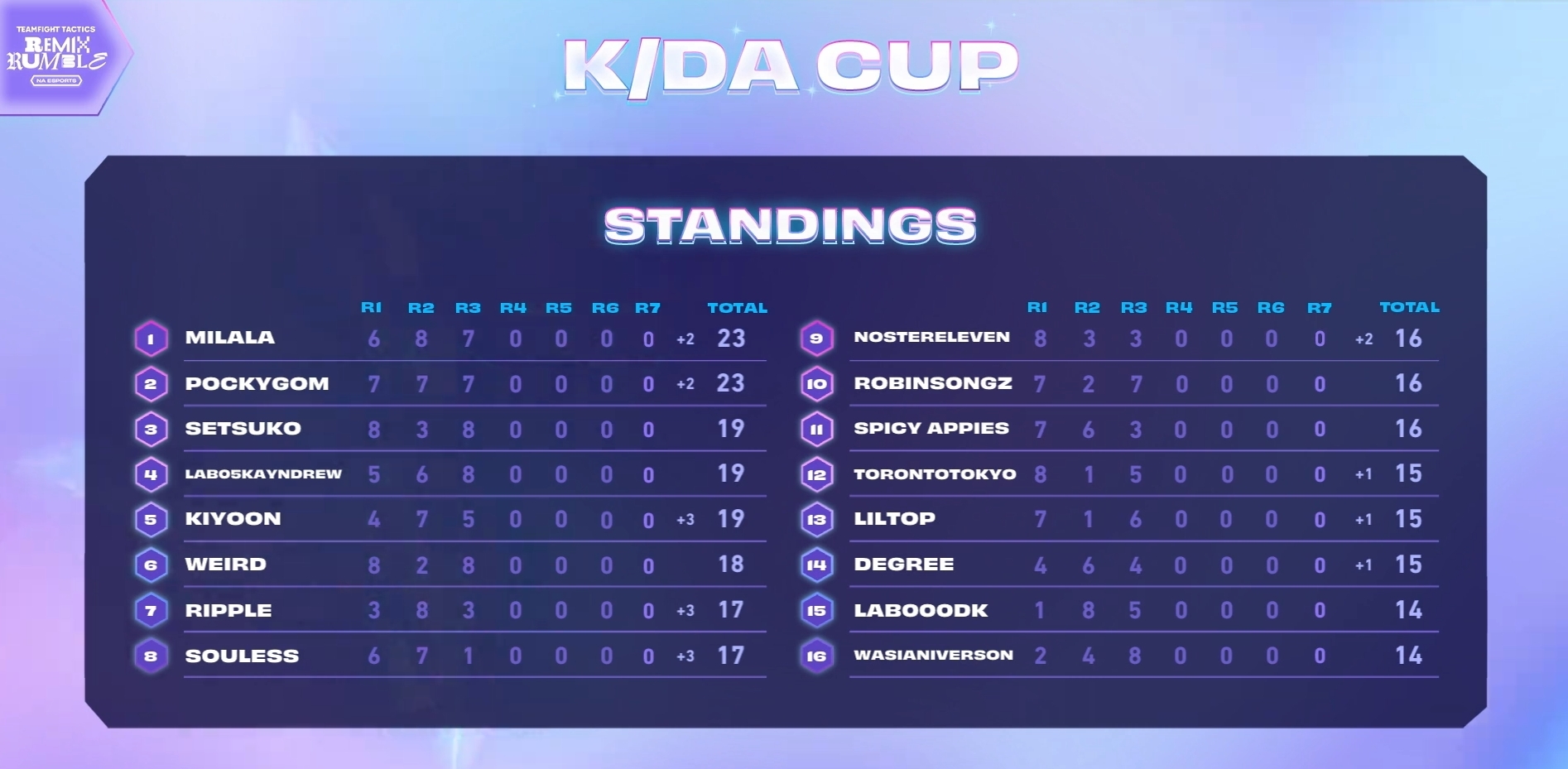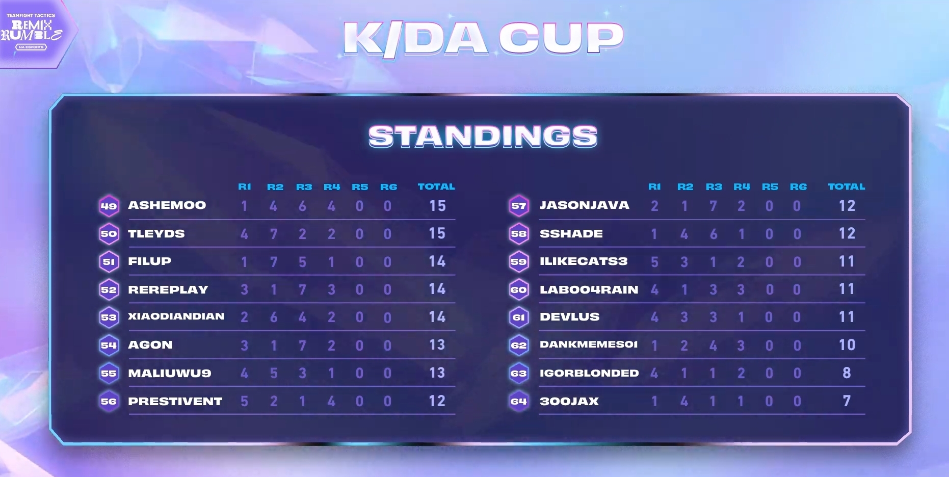 The final two days of the NA K/DA Cup were played on Patch 14.1. All 32 players who advanced from the first weekend joined the 32 TFT players with a bye on day three, playing a total of six rounds. Only 32 of the total 64 advanced onto the final day of the Remix Rumble K/DA Cup.