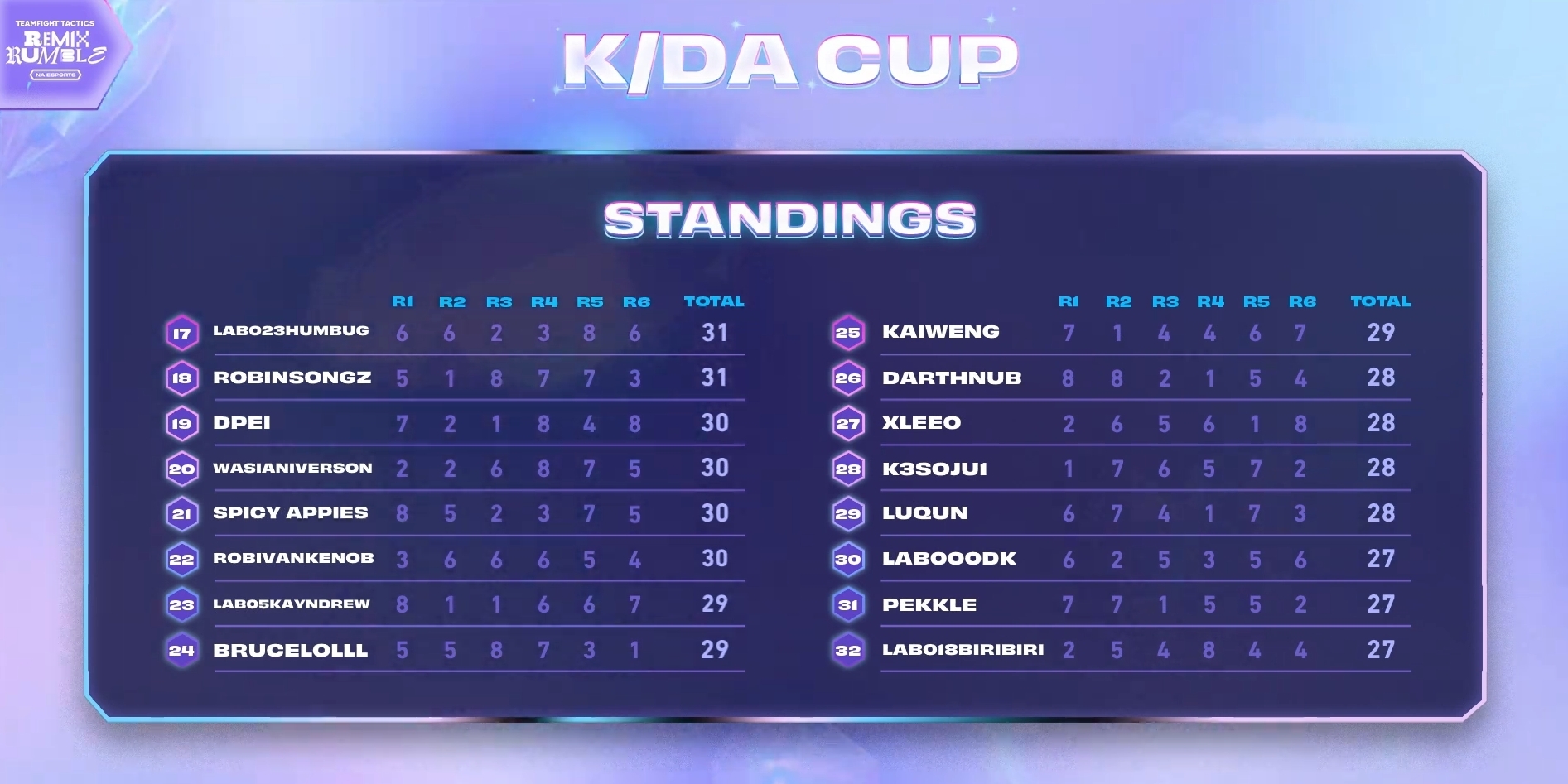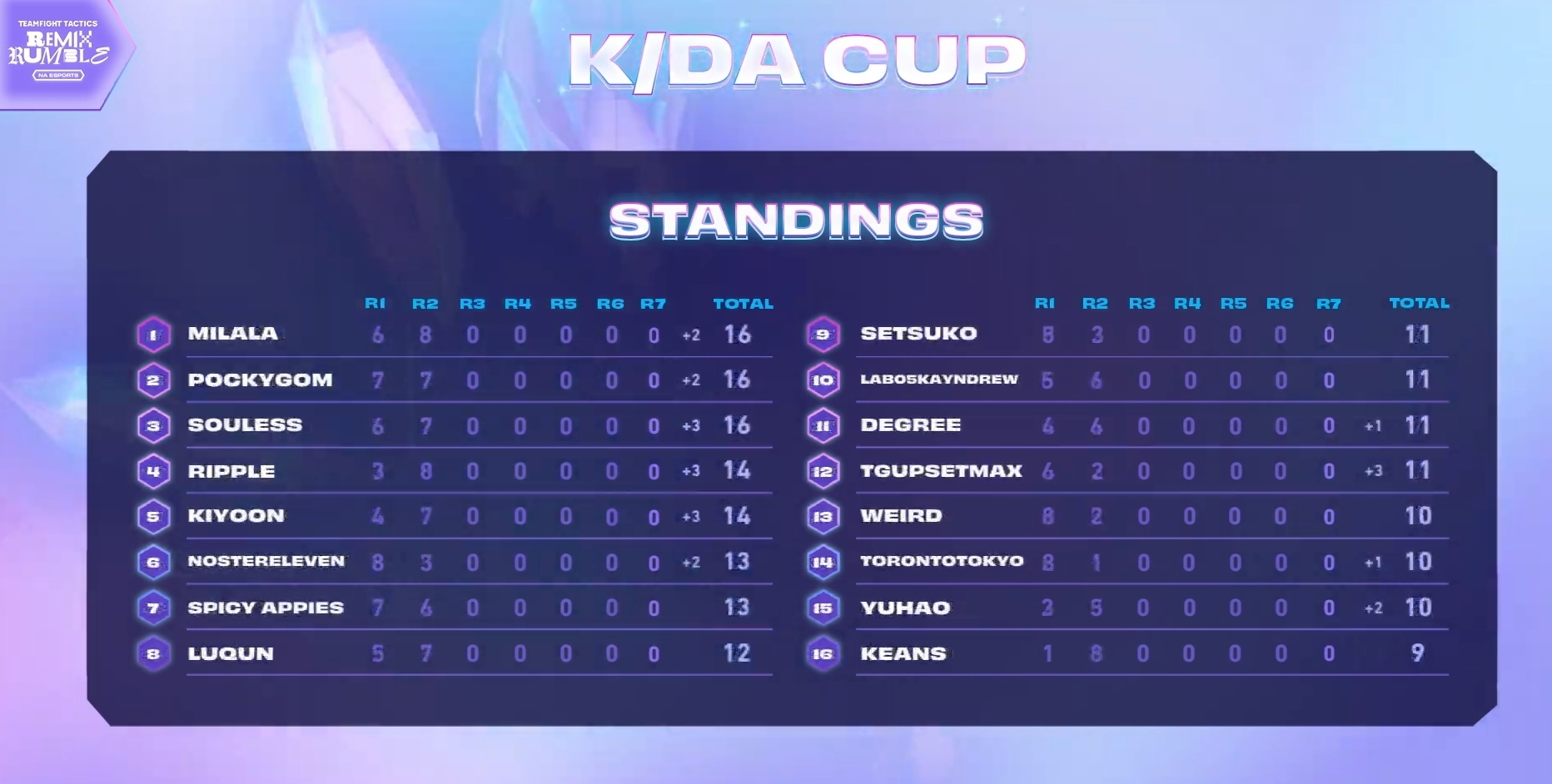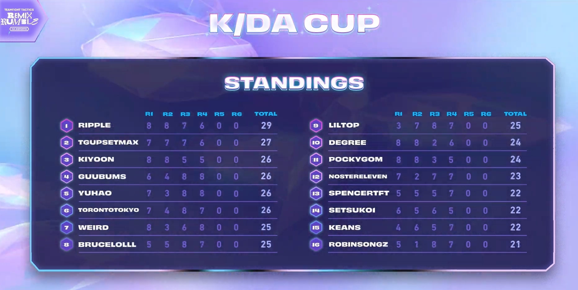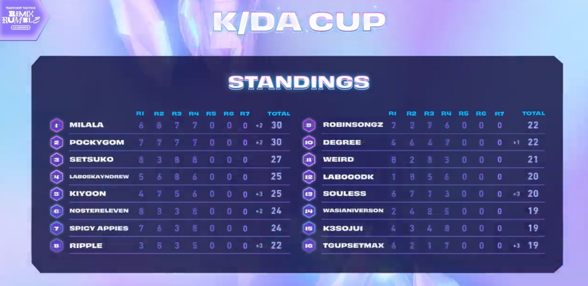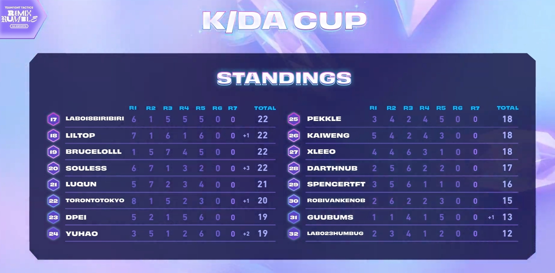 The final two days of the NA K/DA Cup were played on Patch 14.1. All 32 players who advanced from the first weekend joined the 32 TFT players with a bye on day three, playing a total of six rounds. Only 32 of the total 64 advanced onto the final day of the Remix Rumble K/DA Cup.