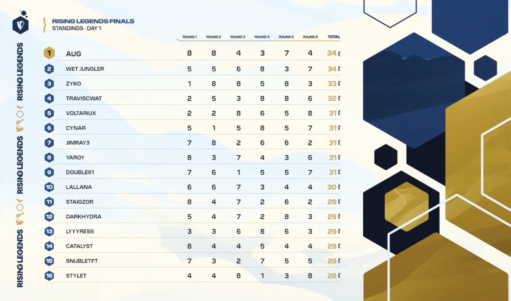 Tying for first after six games played were AUG and Wet Jungler, \each having 34 points. Close behind the leaders were Zyko, Traviscwat, and Voltariux. Sitting on the bubble heading into day two were players like Stylet, 5454, L3S Coco, Ging, Lelouch, Deisik, and Skipaeus.