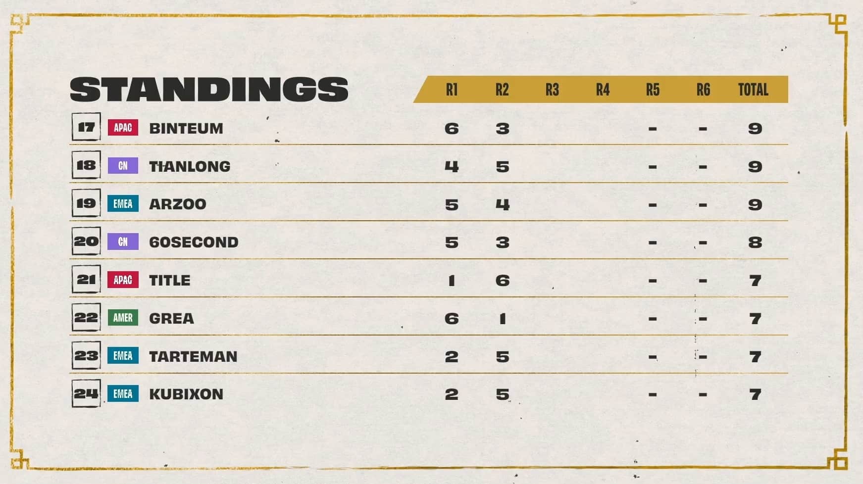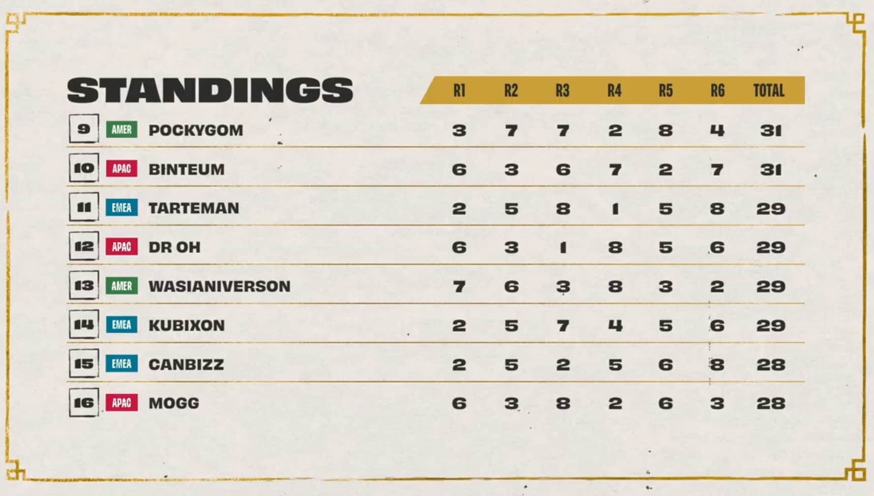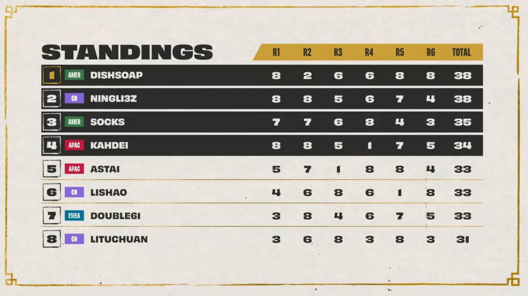 After game six, Dishsoap was tied for first with Ningli3z at 38 points after earning his third lobby win during game one. Socks was in second with 35 points, and Kahdei was in fourth with 34 points. Dobule61 made it into the top eight with 33 total points, while Pockygom was tied at 31 points.