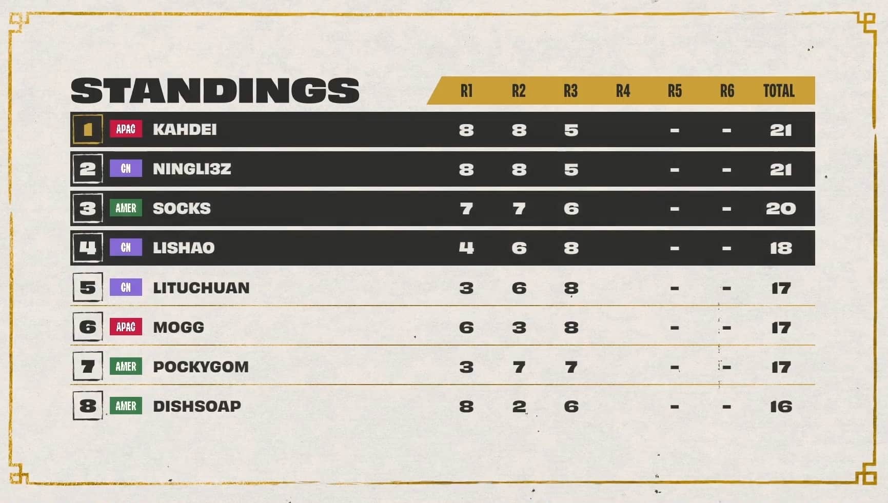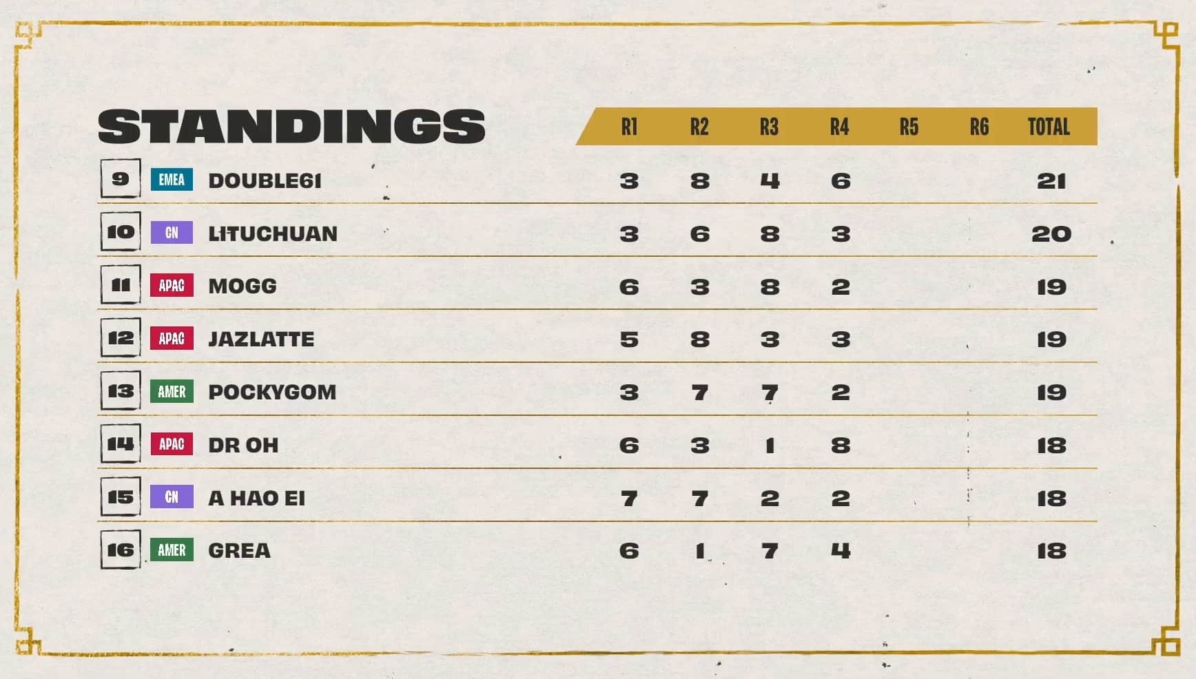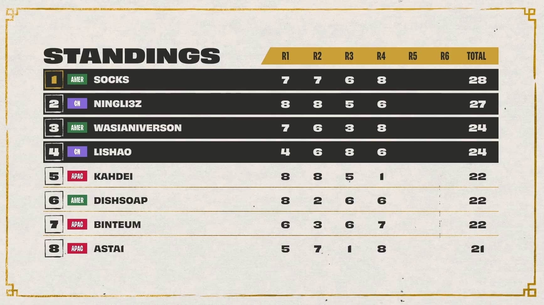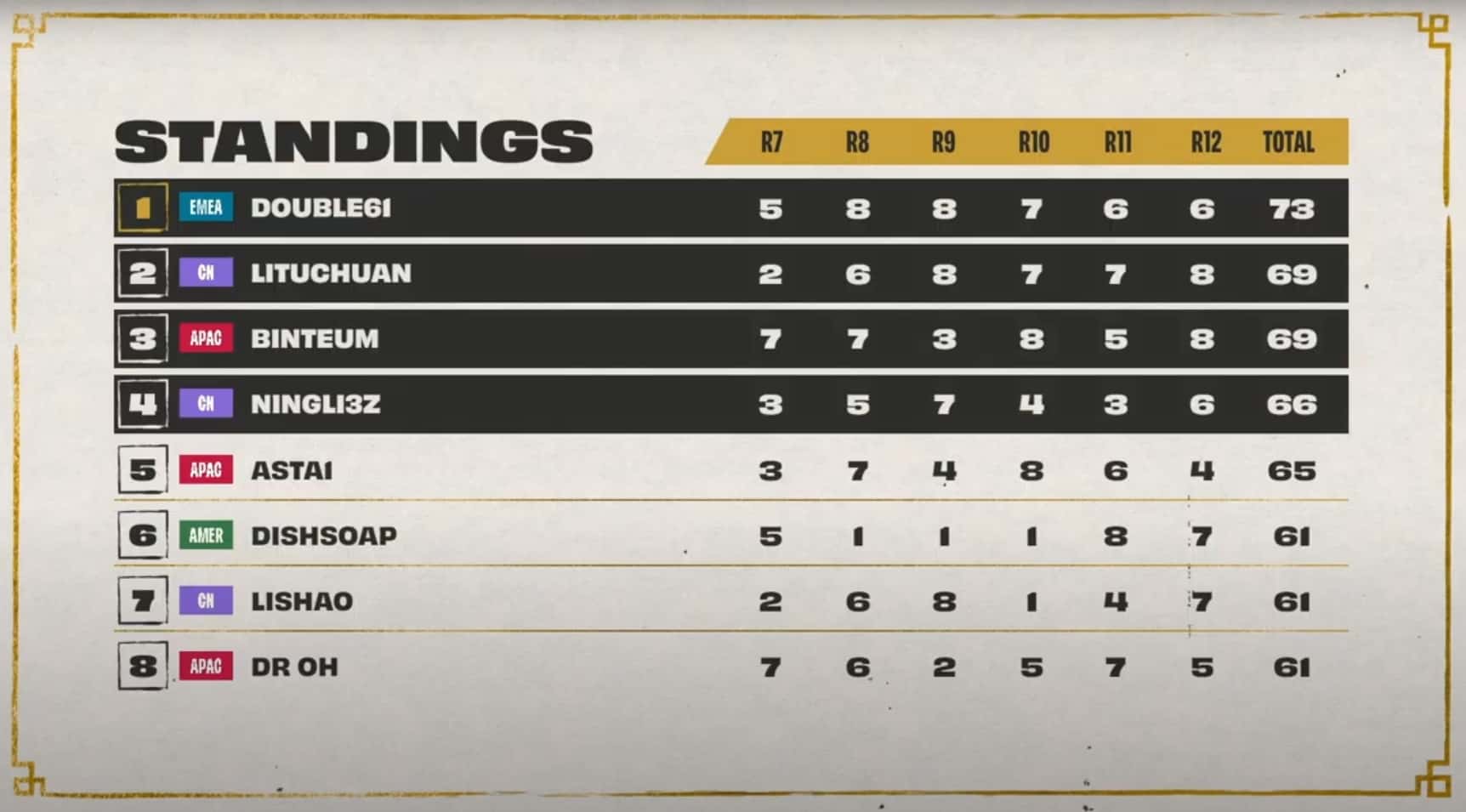 The threshold to hit was 20 points, with Dishsoap, Ningli, and Dobule61 sitting at 18 points after three games. Also in range of cresting the threshold during game four was Asta with 17 points. All three players at 18 points cleared the threshold during game four while Astra, LiShao, and LituChua were within range.