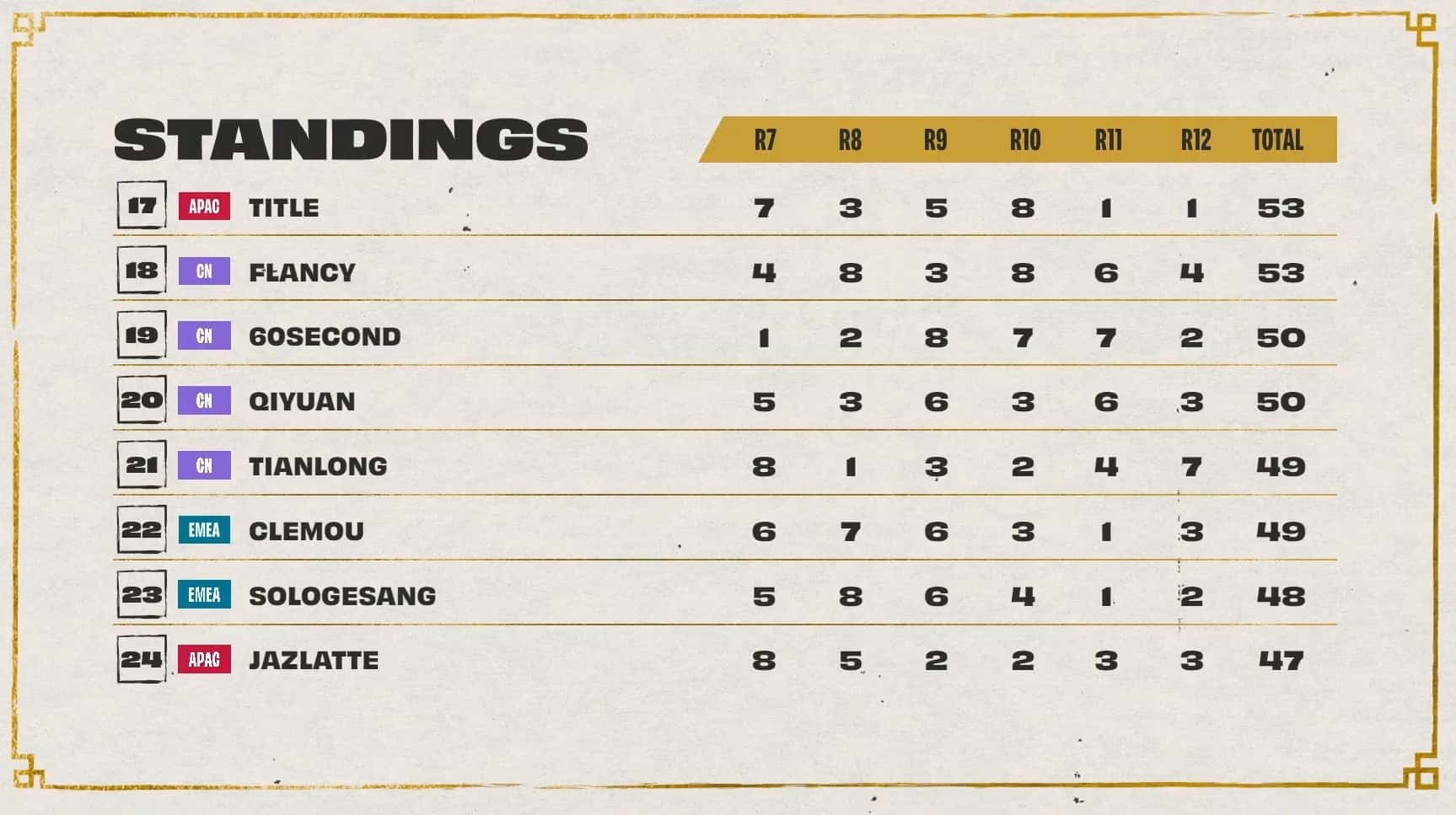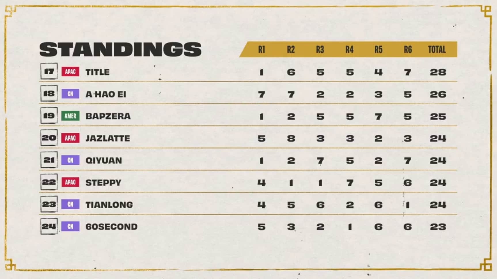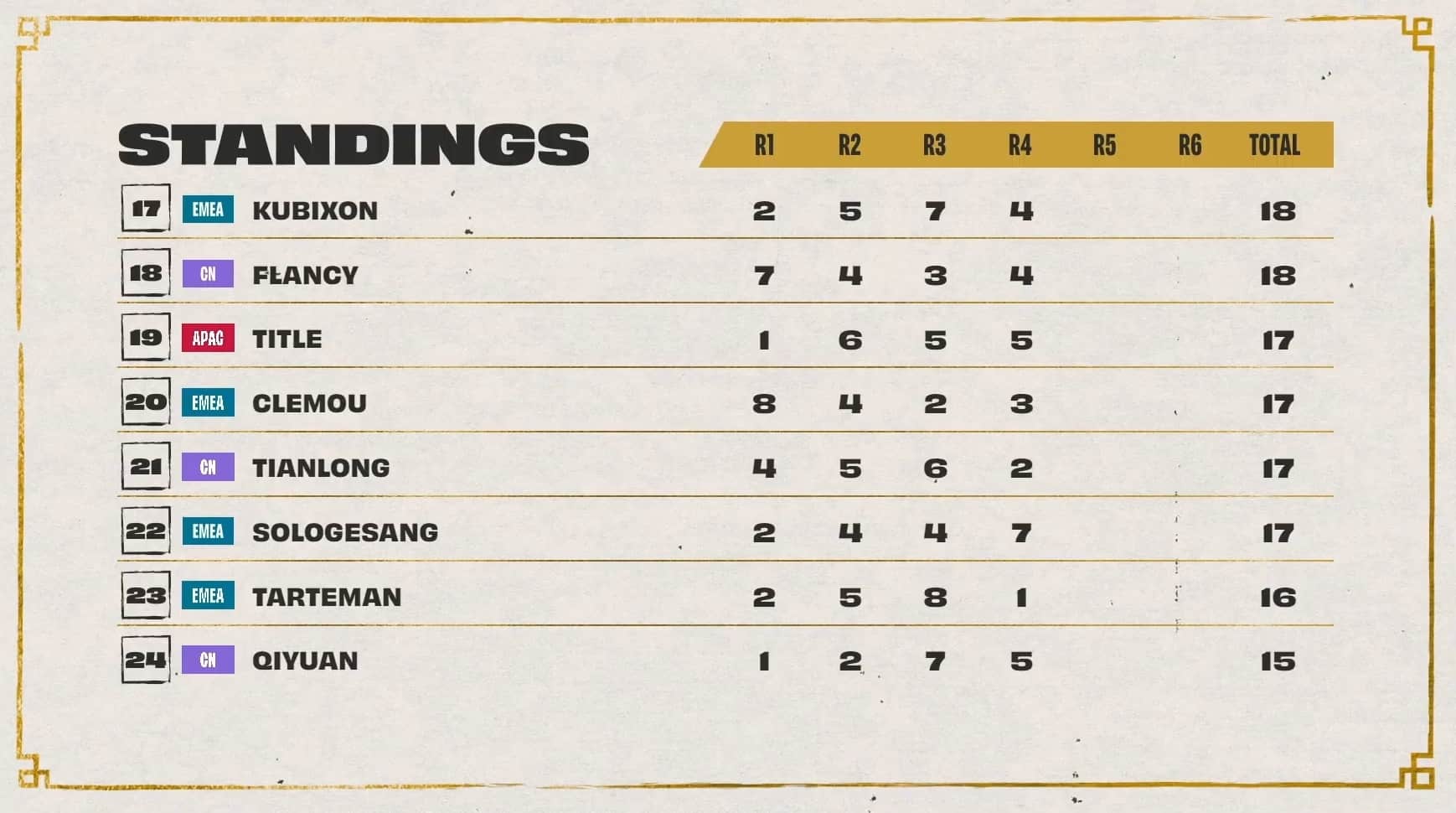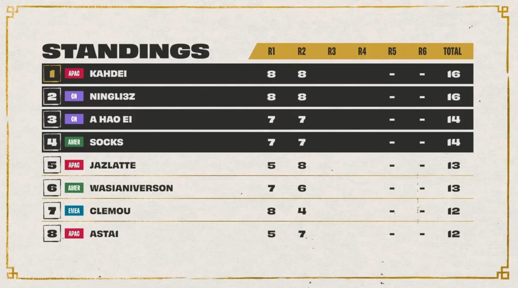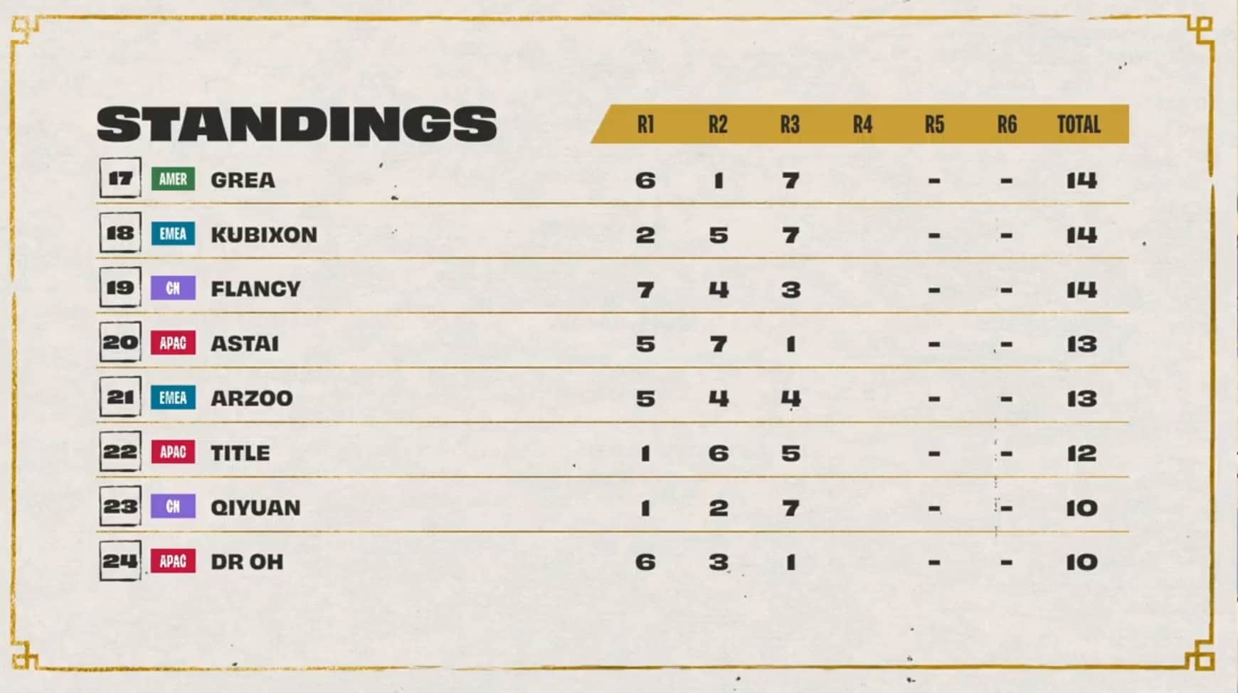 The threshold to hit was 20 points, with Dishsoap, Ningli, and Dobule61 sitting at 18 points after three games. Also in range of cresting the threshold during game four was Asta with 17 points. All three players at 18 points cleared the threshold during game four while Astra, LiShao, and LituChua were within range.