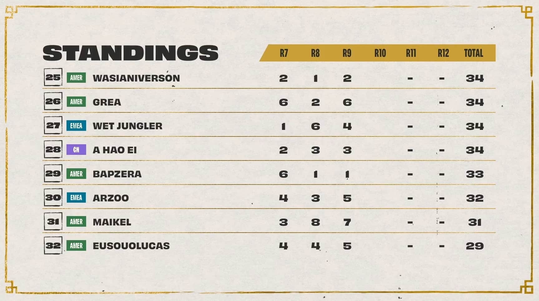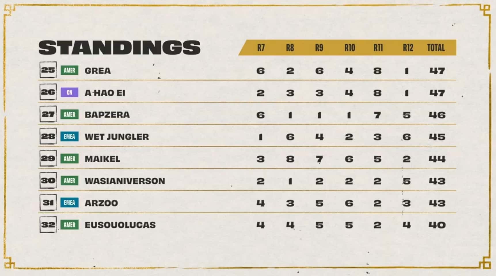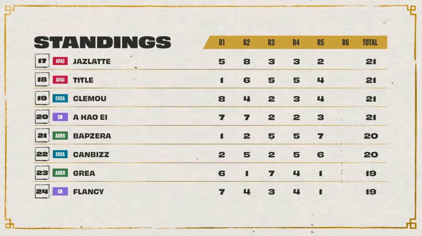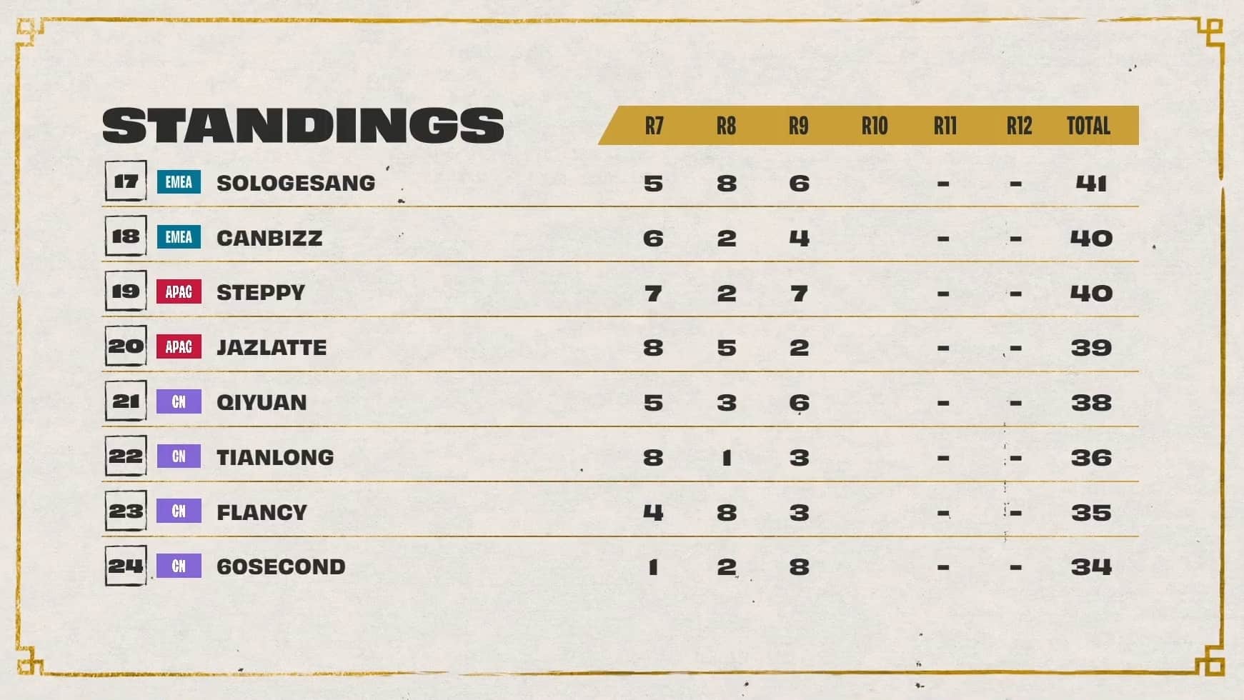 The threshold to hit was 20 points, with Dishsoap, Ningli, and Dobule61 sitting at 18 points after three games. Also in range of cresting the threshold during game four was Asta with 17 points. All three players at 18 points cleared the threshold during game four while Astra, LiShao, and LituChua were within range.