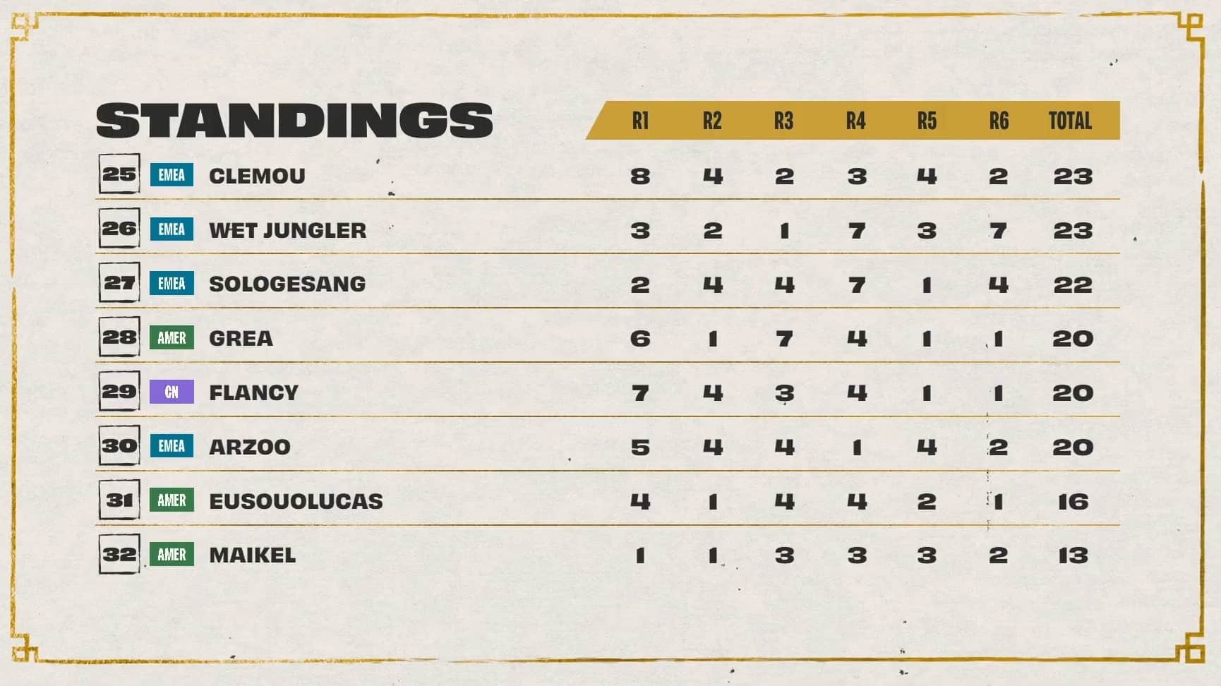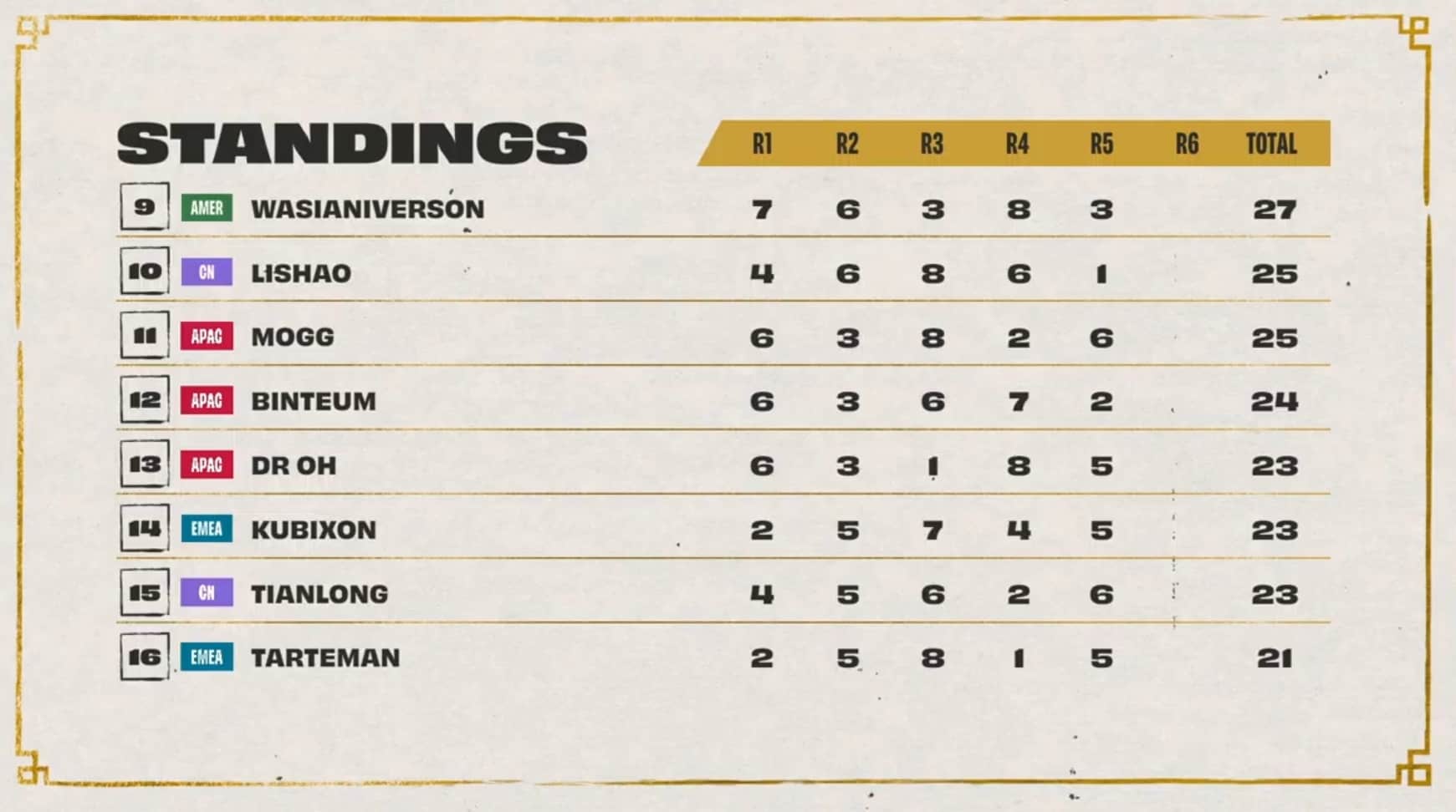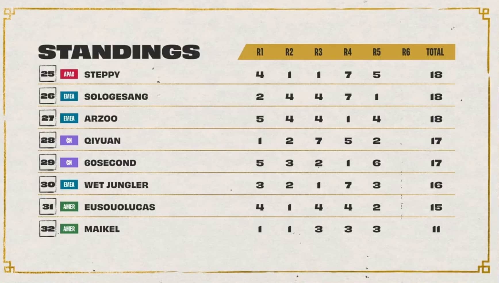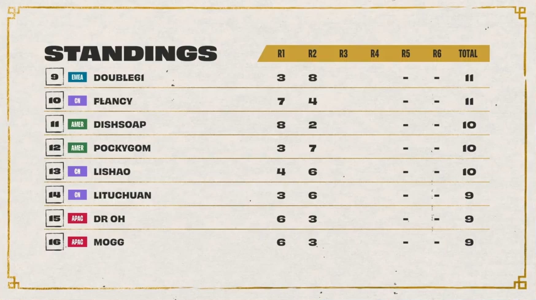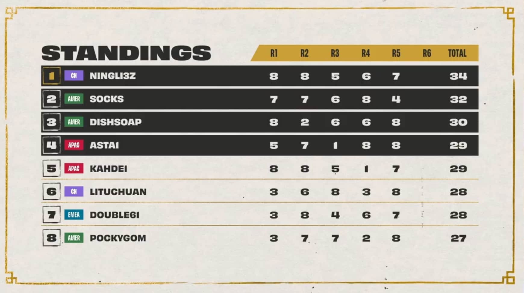 Dishsoap rocked the Princess and Frog comp during game five to win his lobby, while Pockygom also earned a first-place finish. Ningli3z reclaimed the top leaderboard spot for China asDouble61 earned a second spot pushing EMEA closer to the top eight.