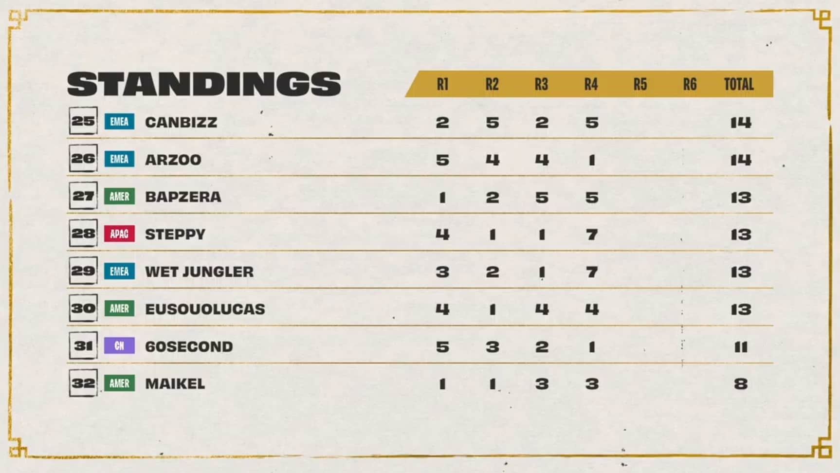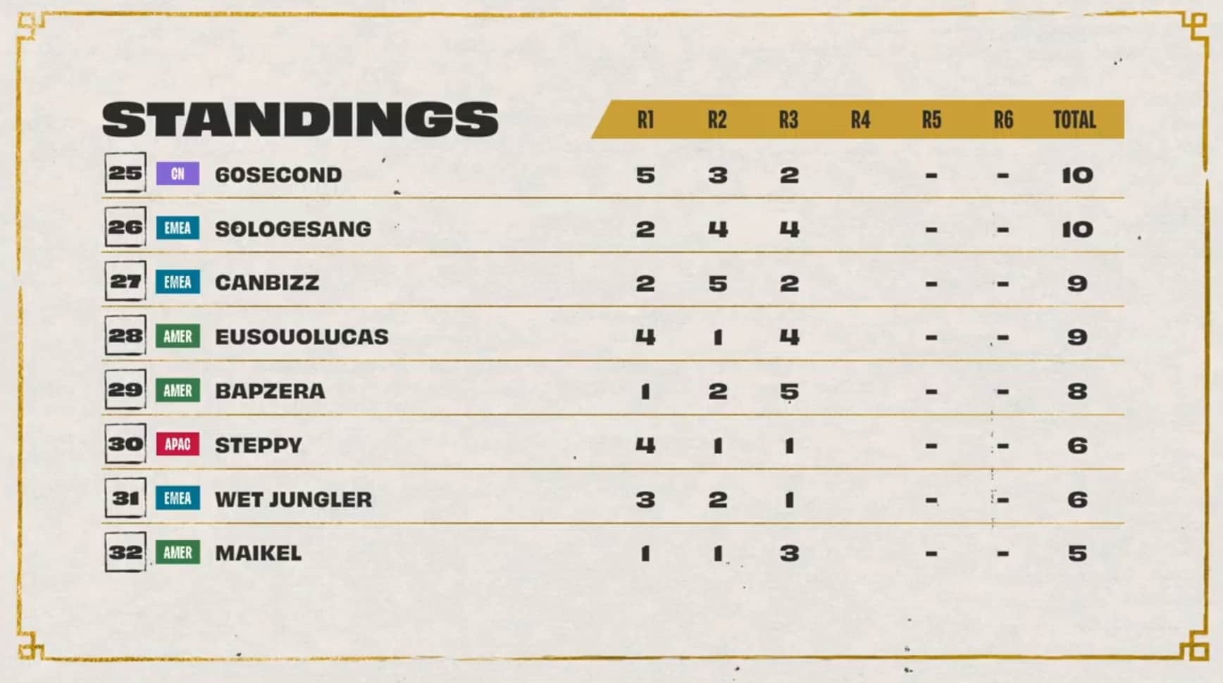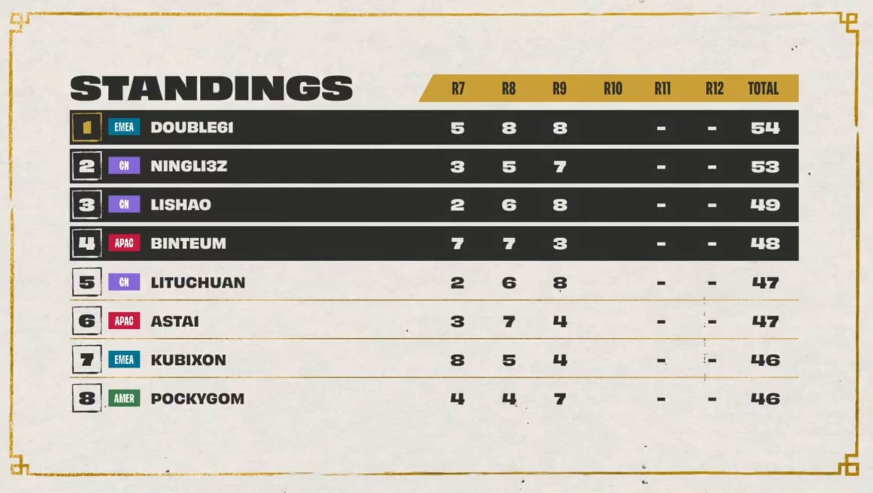 Day two played out much differently for NA players. Dishsoap fell out of the top eight with back-to-back eighth-place finishes during games two and three. Socks also fell in standings with an eighth during games one and three. EMEA rebounded with the former World Champion Double61 taking the top leaderboard spot after three games.