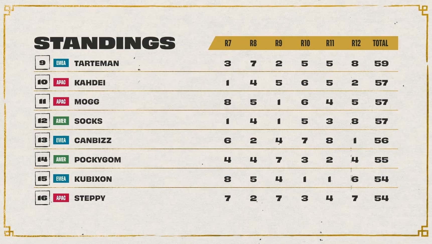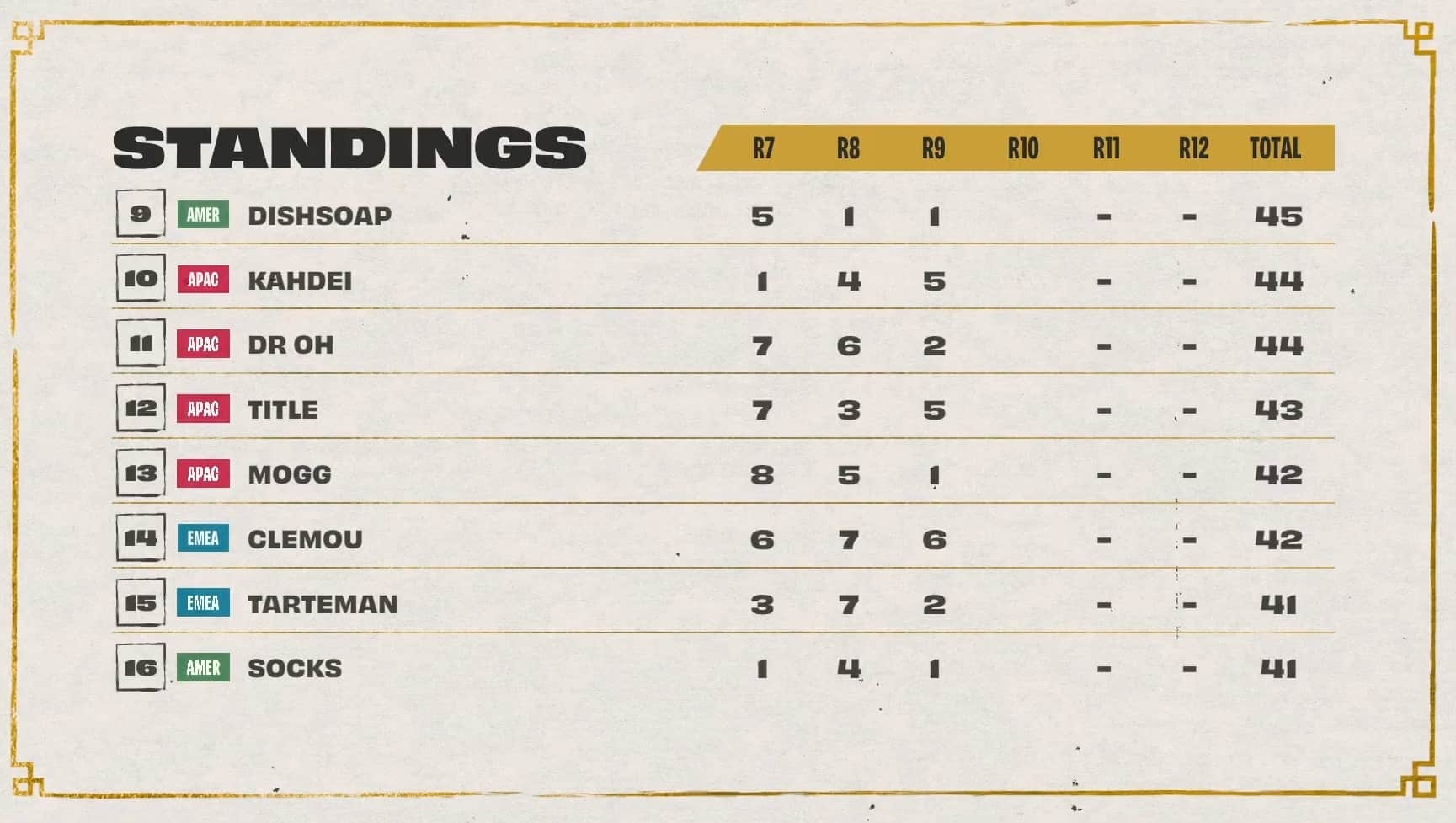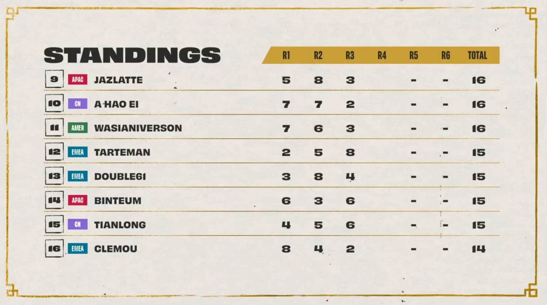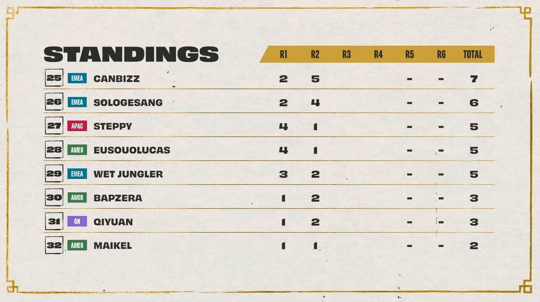 Day two played out much differently for NA players. Dishsoap fell out of the top eight with back-to-back eighth-place finishes during games two and three. Socks also fell in standings with an eighth during games one and three. EMEA rebounded with the former World Champion Double61 taking the top leaderboard spot after three games.