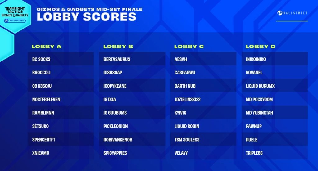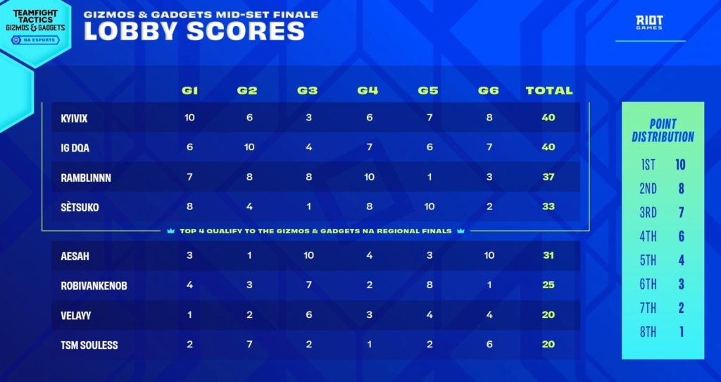 Following six games played, Kyivix, DQA, Ramblinnn, and sètsuko advanced to the NA Regional Finals. and Aesah, Robivankenob, Velayy, and Souless earned an invite to the TFT Set 6.5 Innovator Cup.