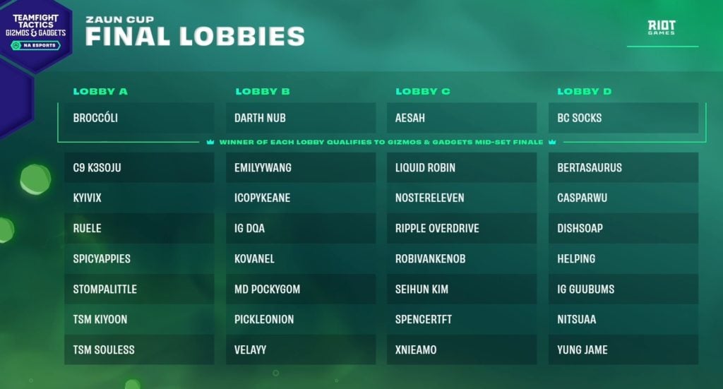 From open qualifier rounds to the top 32 Teamfight Tactics competitors tearing up the North American ladder rankings in Set Six, four players will advance from the Zaun Cup to the Gizmos & Gadgets Mid-Set Finale.