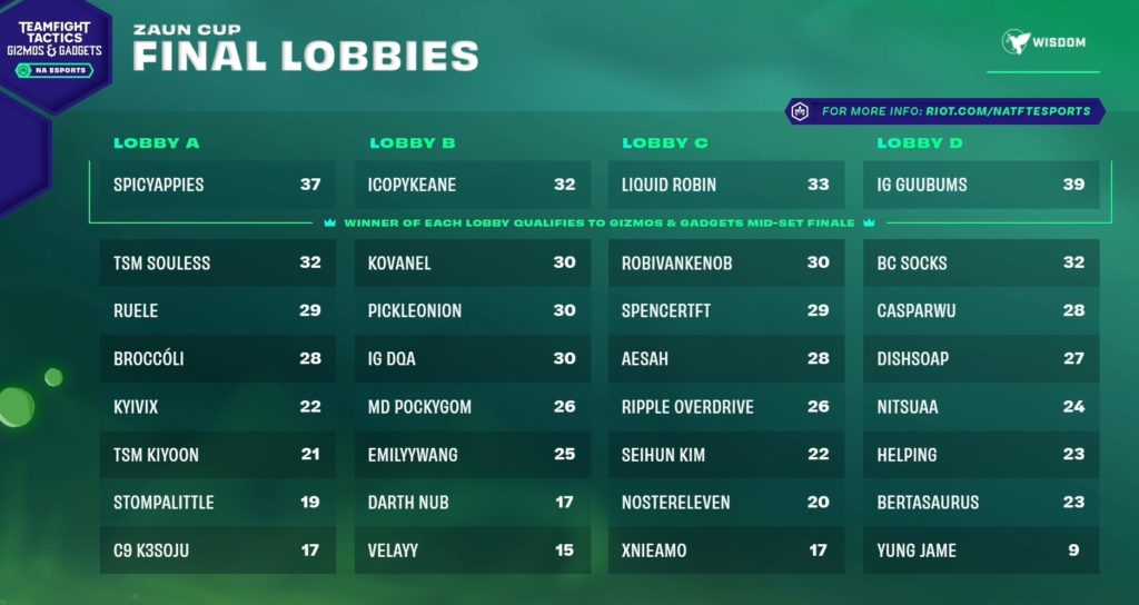 Despite earning an invite to the Mid-Set Finale via the Challenger Series, SpicyAppies continued his dominance within TFT Set Six by earning a first-place finish in Lobby A. TL Robinsongz took a first in Lobby C and IcopyKeane earned an invite to the Mid-Set Finale with a first in Lobby B.