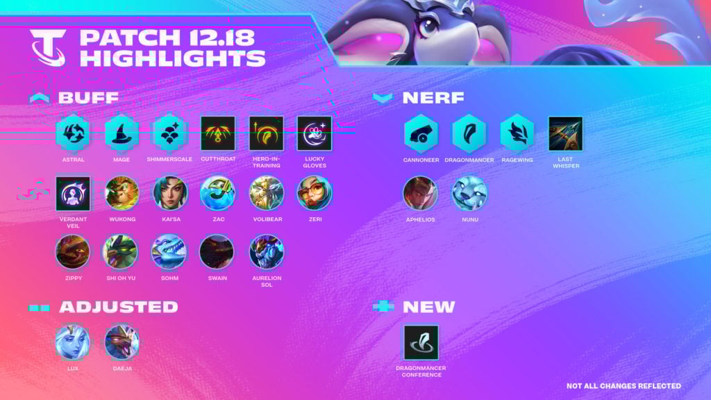 Only a few TFT Set 7.5 Draconic Augments were hit with balance changes in Patch 12.18, while a new Dragonmancer Conference Augment was added. Lucky Gloves was tweaked again, improving items granted while always guaranteeing full items. Verdant Veil received a significant buff and Ricochet was nerfed slightly, along with Weakspot.