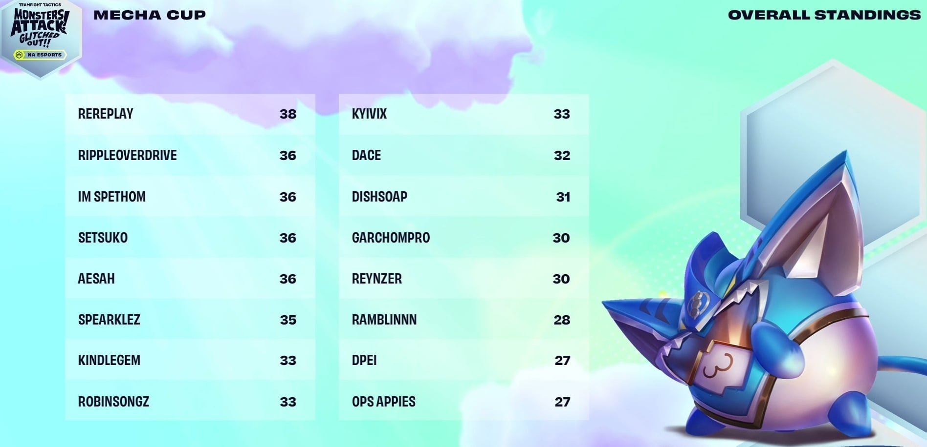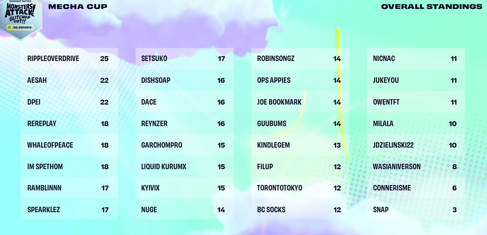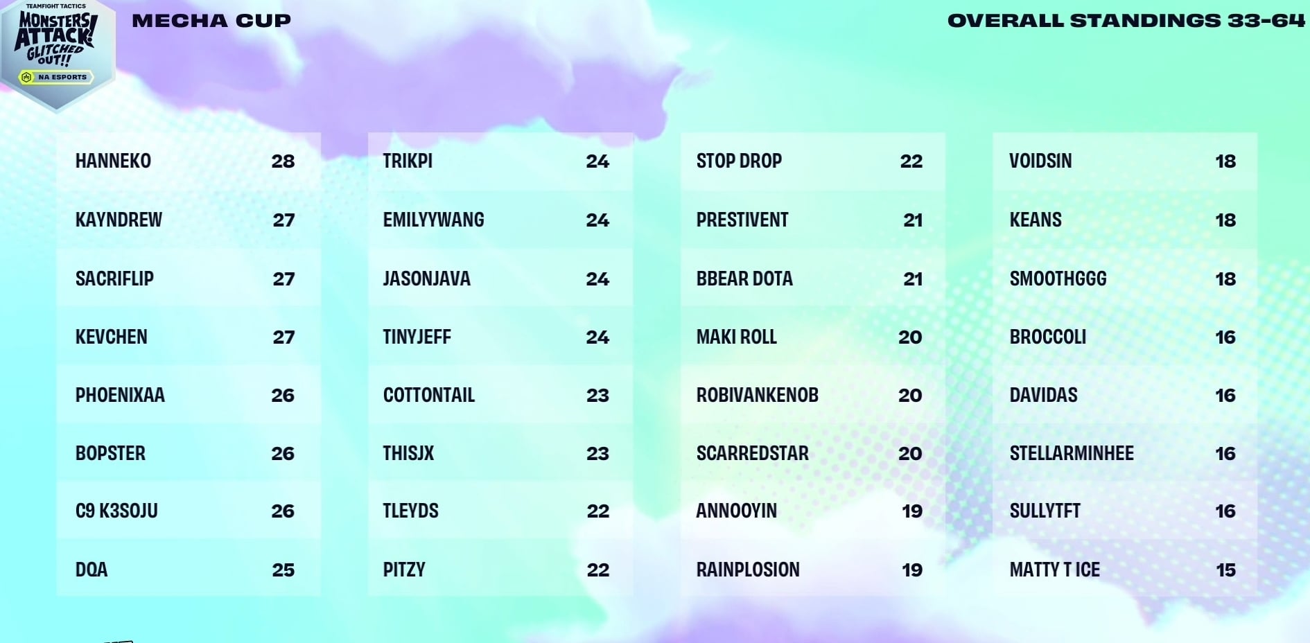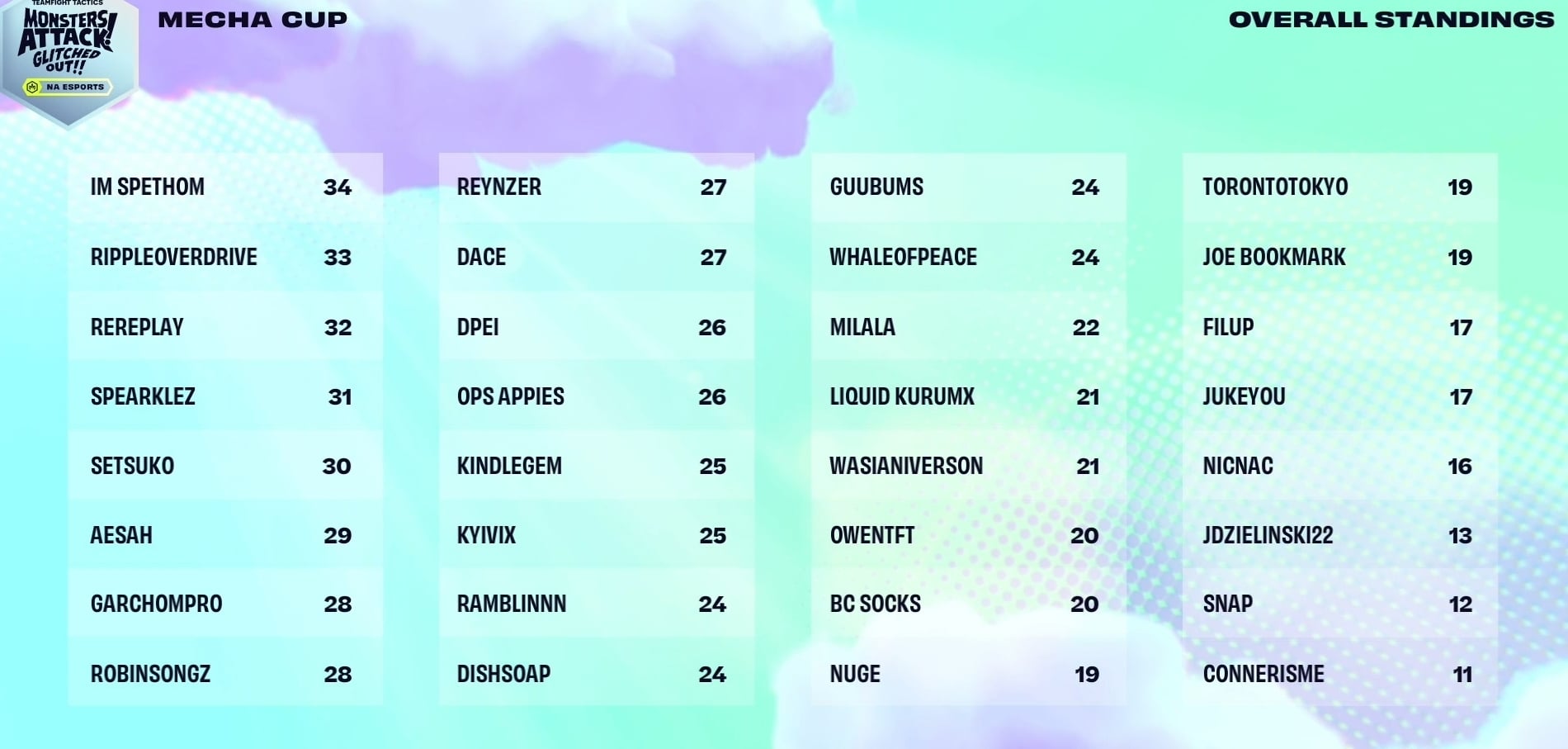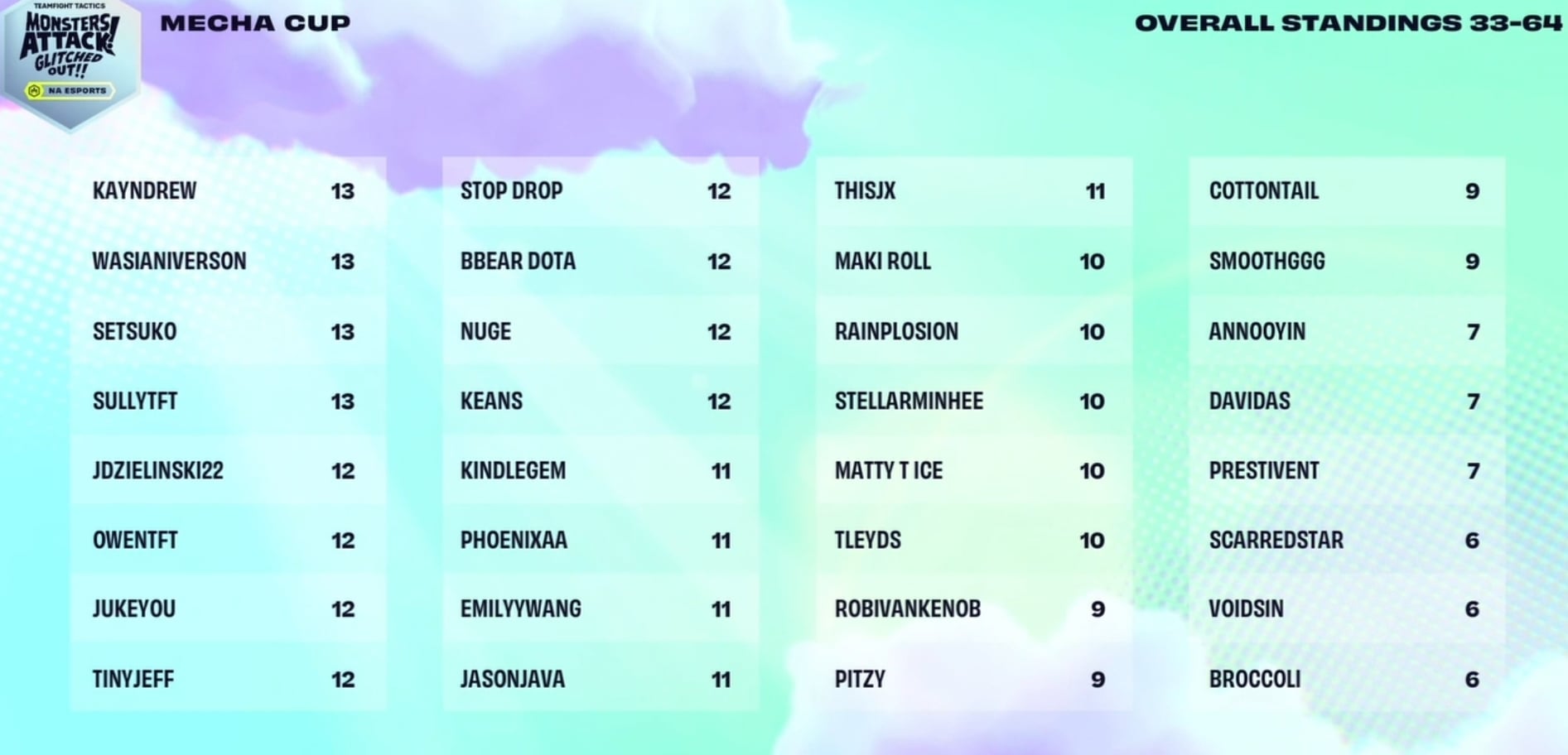 A total of 32 players advanced from the first weekend to the second, combining with the top 32 Ranked NA players on the TFT ladder. Six games were played with lobbies getting reseeded every two rounds. Of the starting 64 players, only the top 32 advance to the final day of the TFT Mecha Cup.