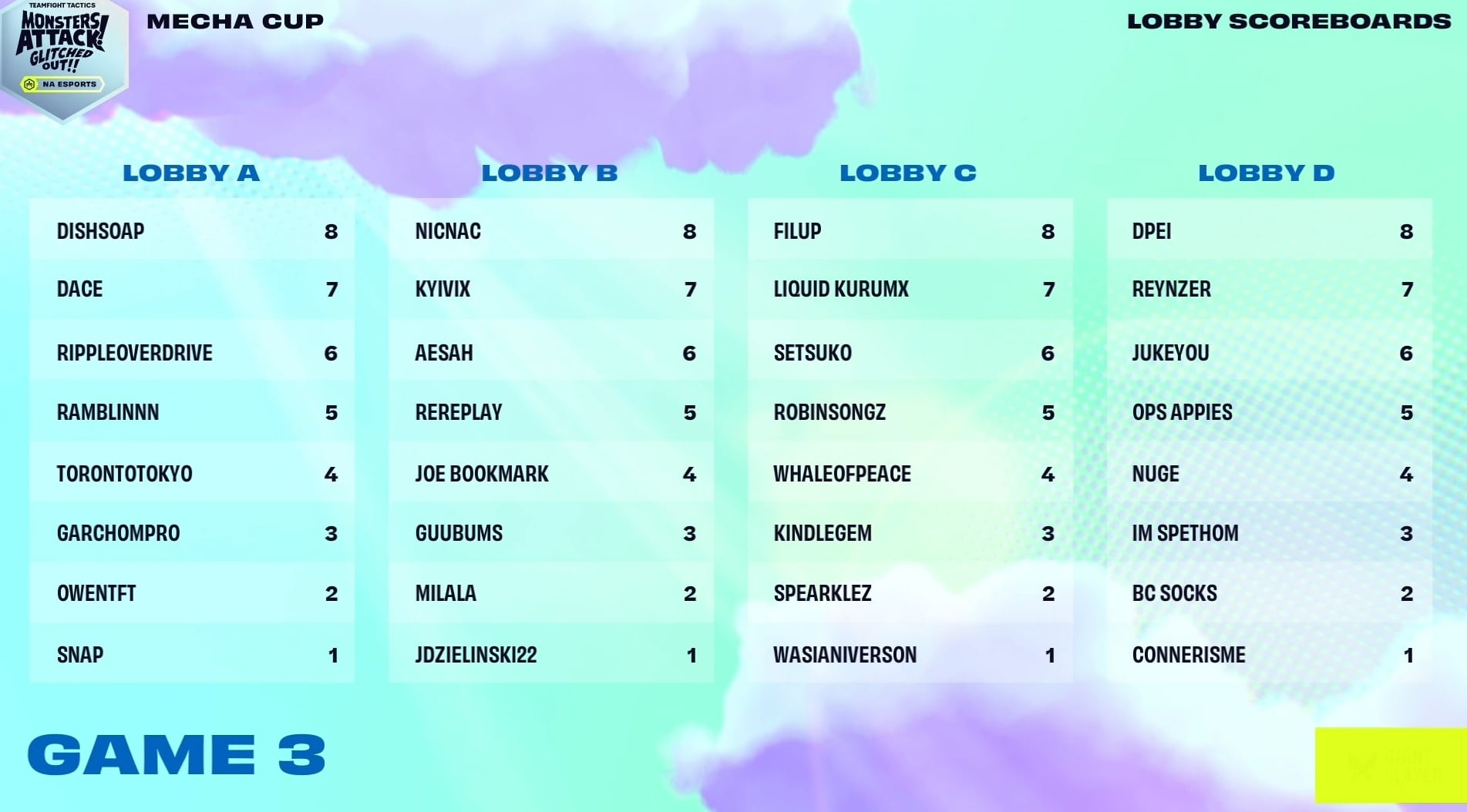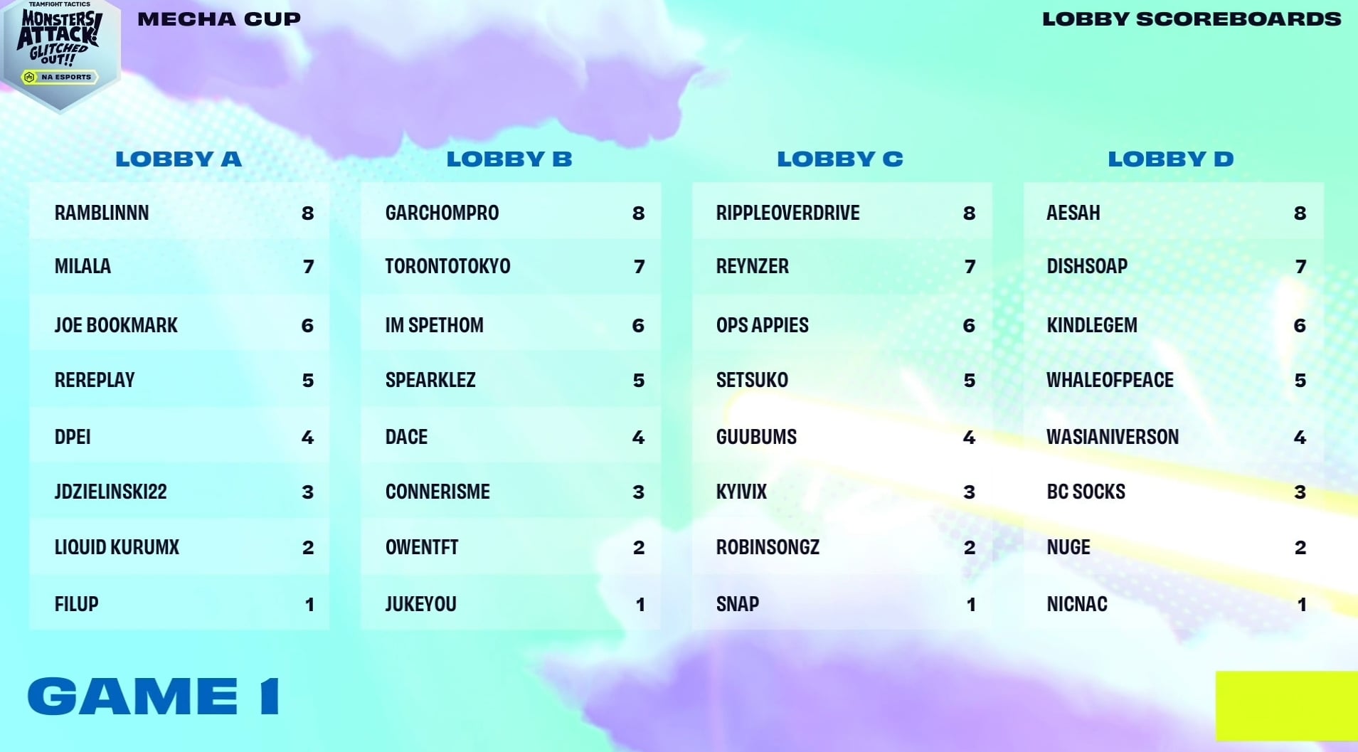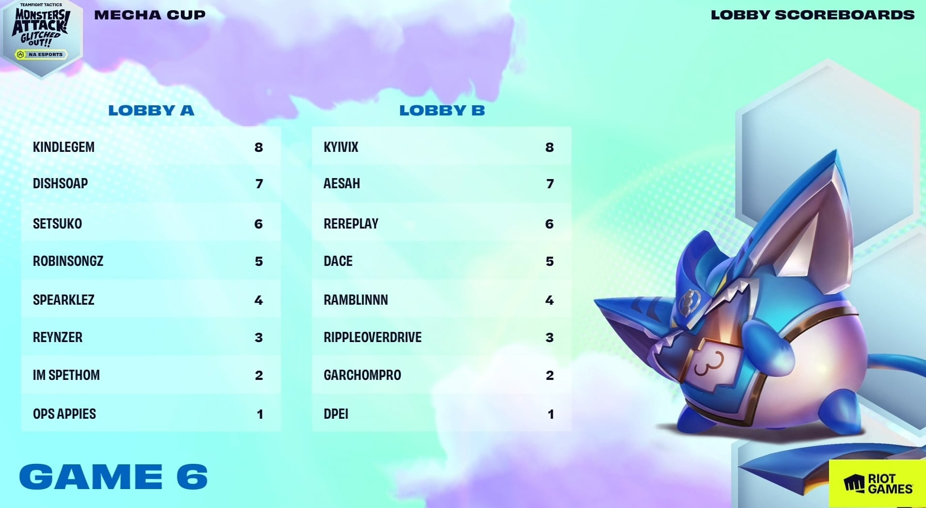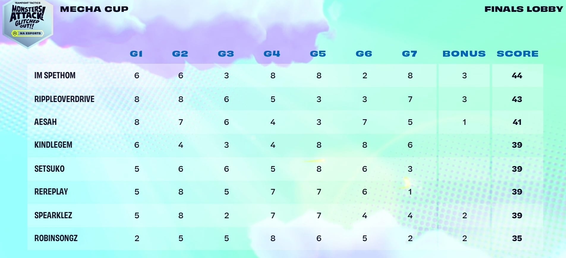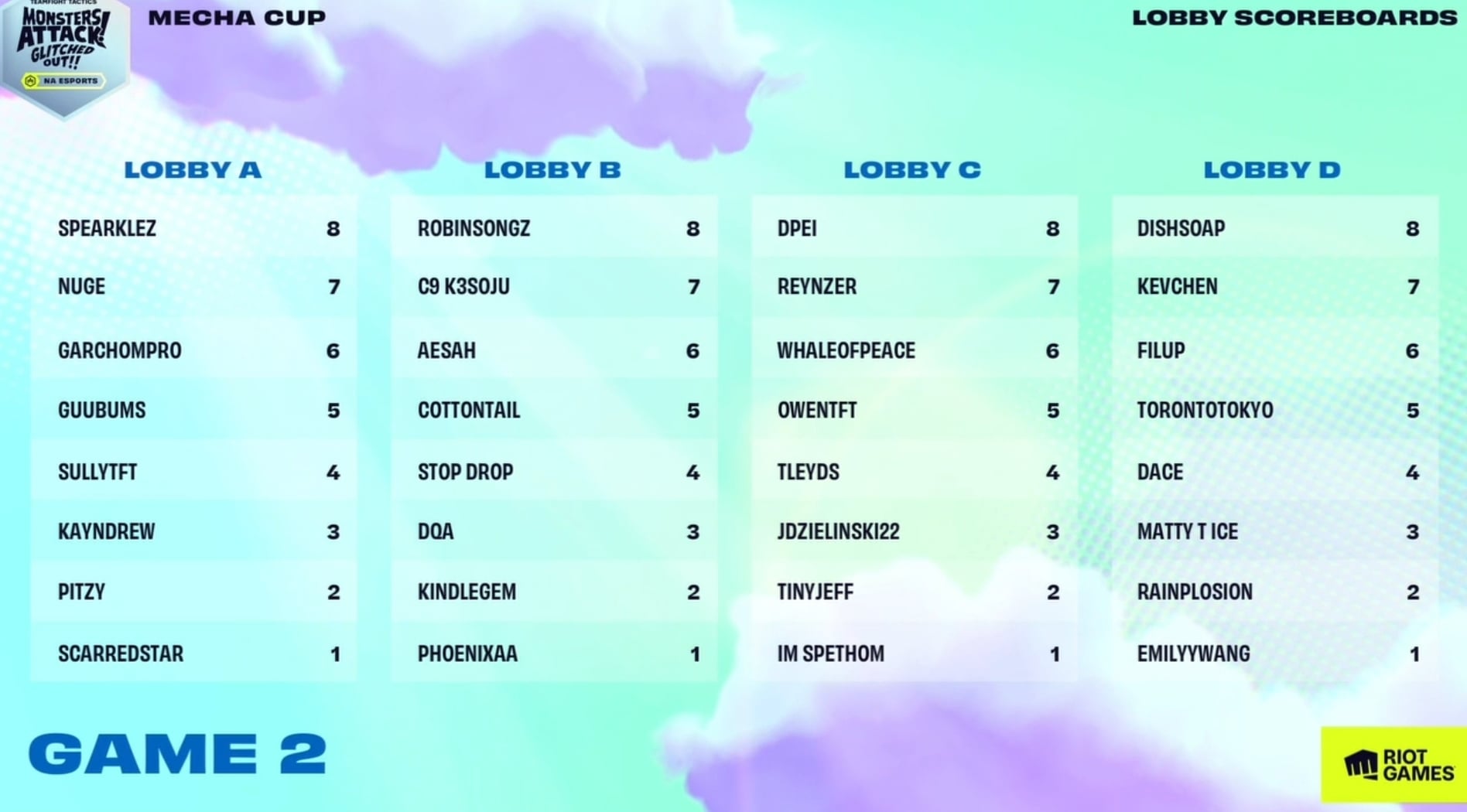 A total of 32 players advanced from the first weekend to the second, combining with the top 32 Ranked NA players on the TFT ladder. Six games were played with lobbies getting reseeded every two rounds. Of the starting 64 players, only the top 32 advance to the final day of the TFT Mecha Cup.