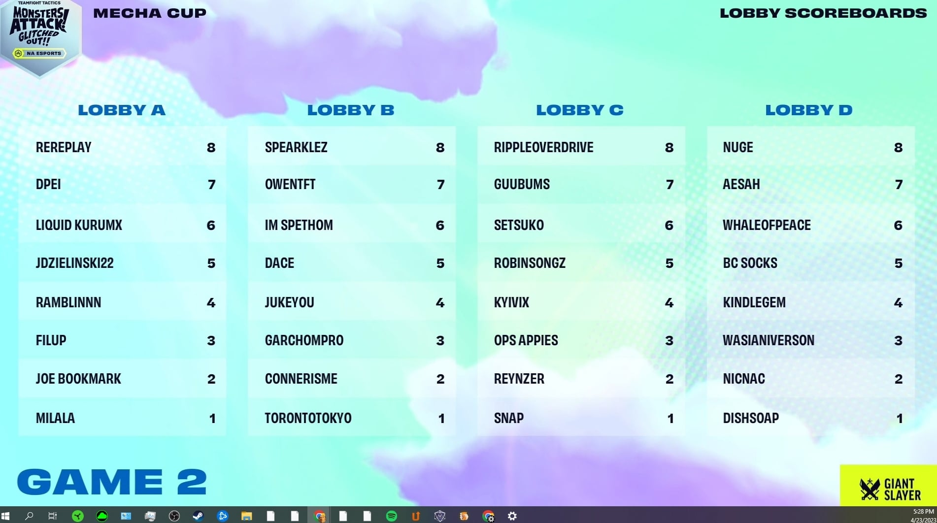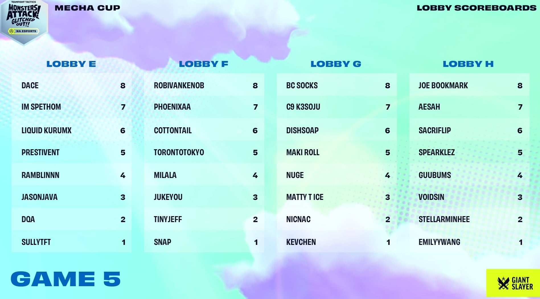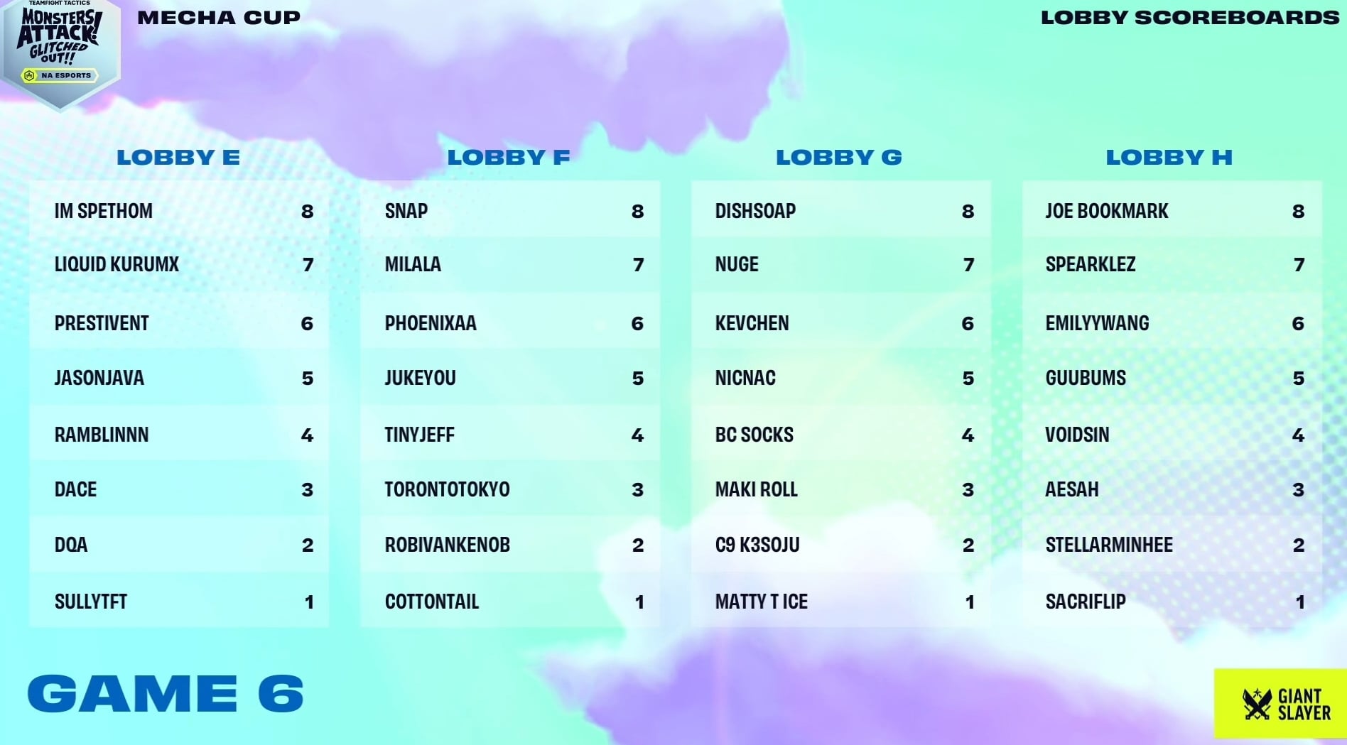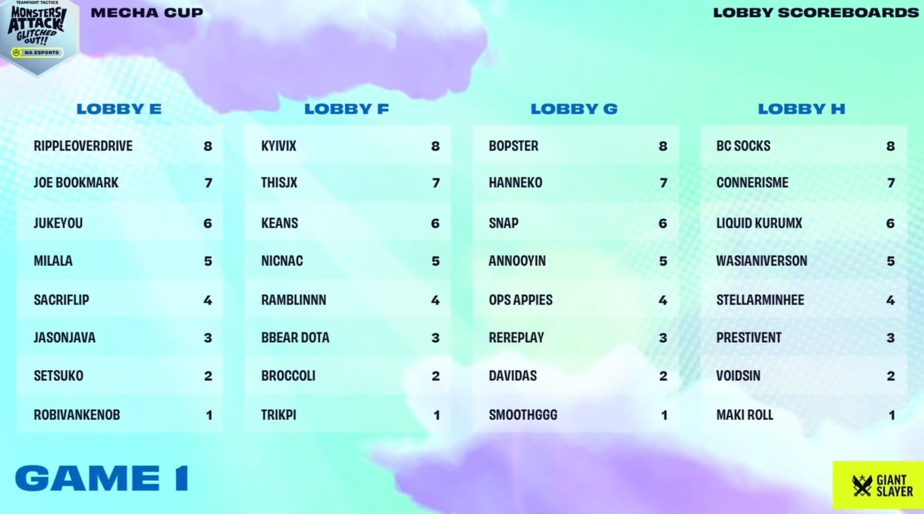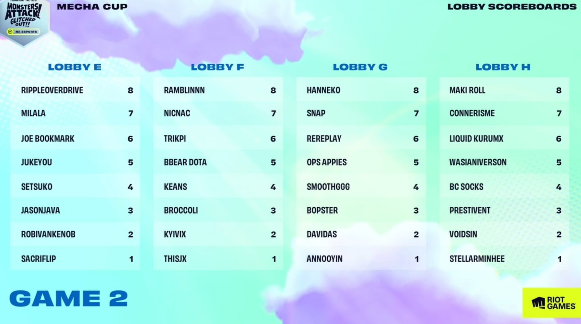 A total of 32 players advanced from the first weekend to the second, combining with the top 32 Ranked NA players on the TFT ladder. Six games were played with lobbies getting reseeded every two rounds. Of the starting 64 players, only the top 32 advance to the final day of the TFT Mecha Cup.