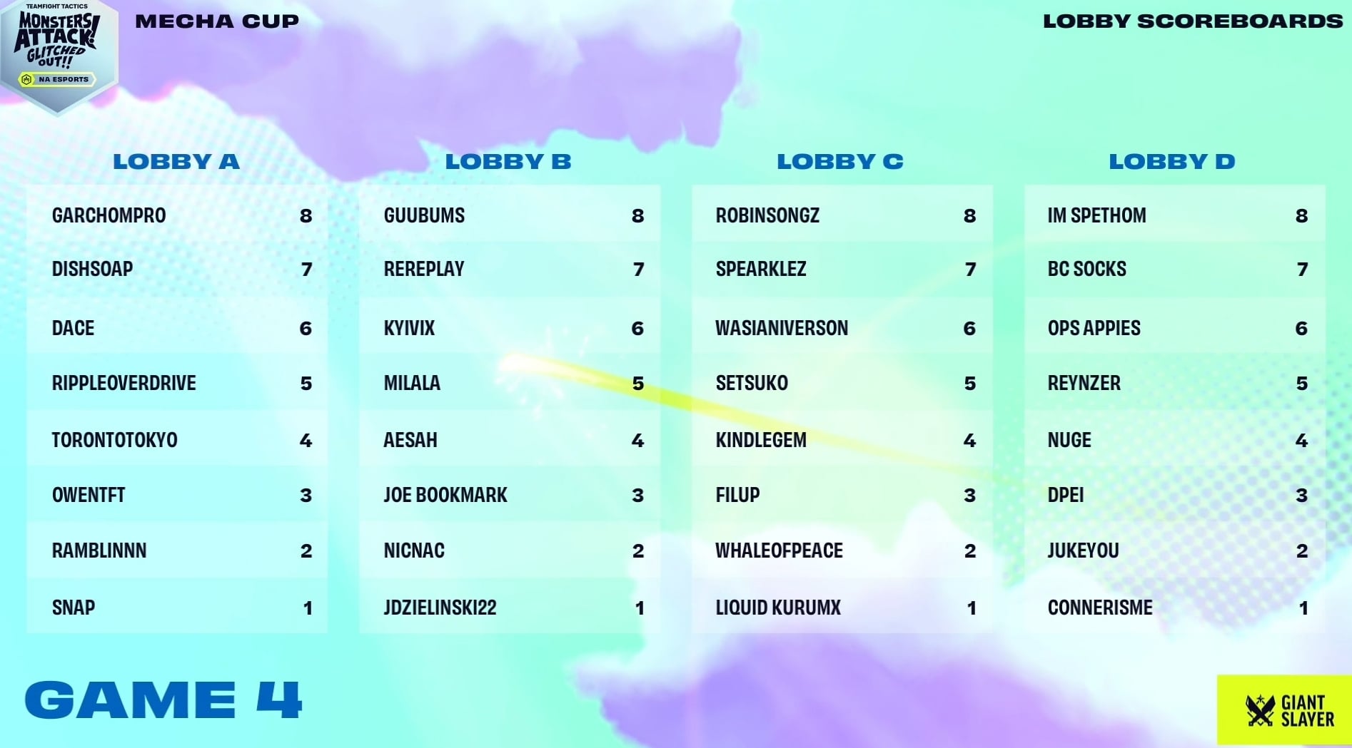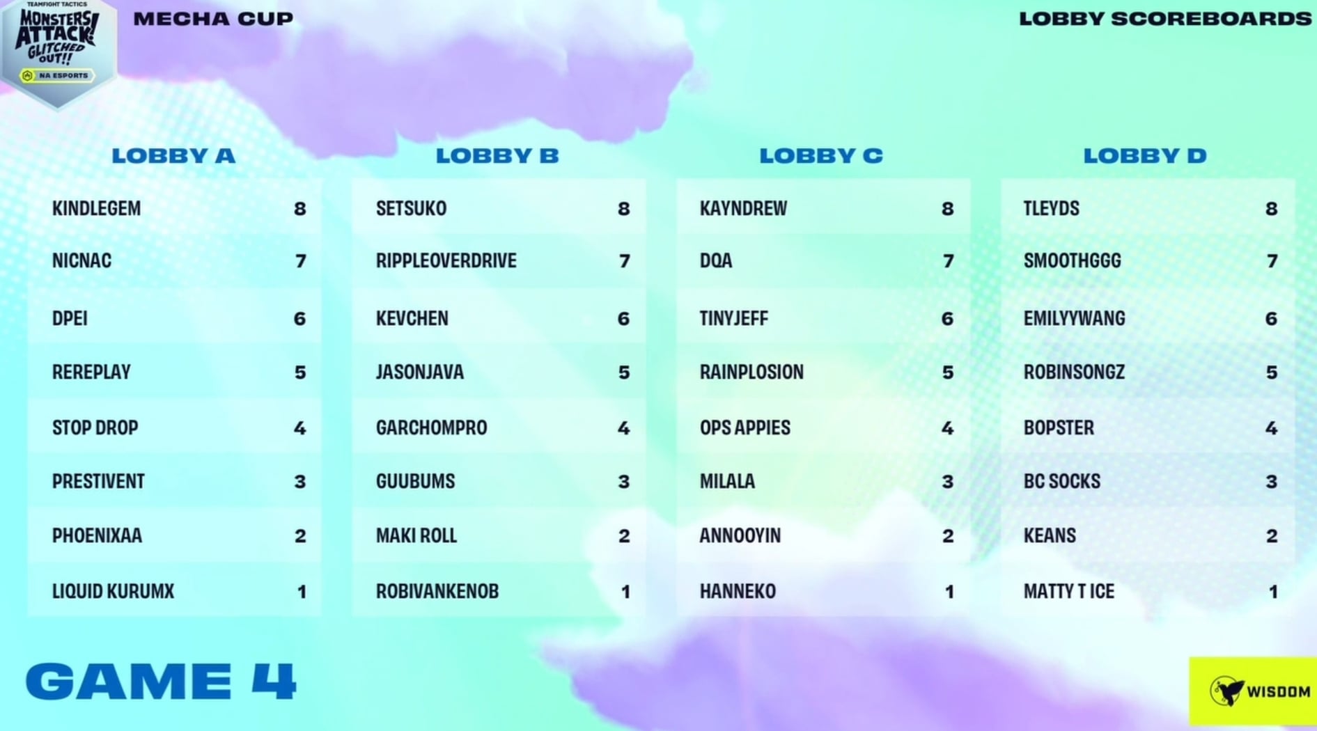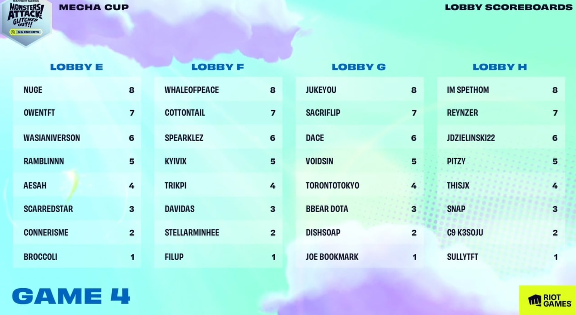 Day four of the NA Mecha Cup featured the top 32 players from day three, with only four earning an invite to the North American TFT Regional Finals. Five games were played before the field was cut to 16 players and only the top eight advanced to the final and seventh game of the day. All points carried over into games six and seven following cuts.