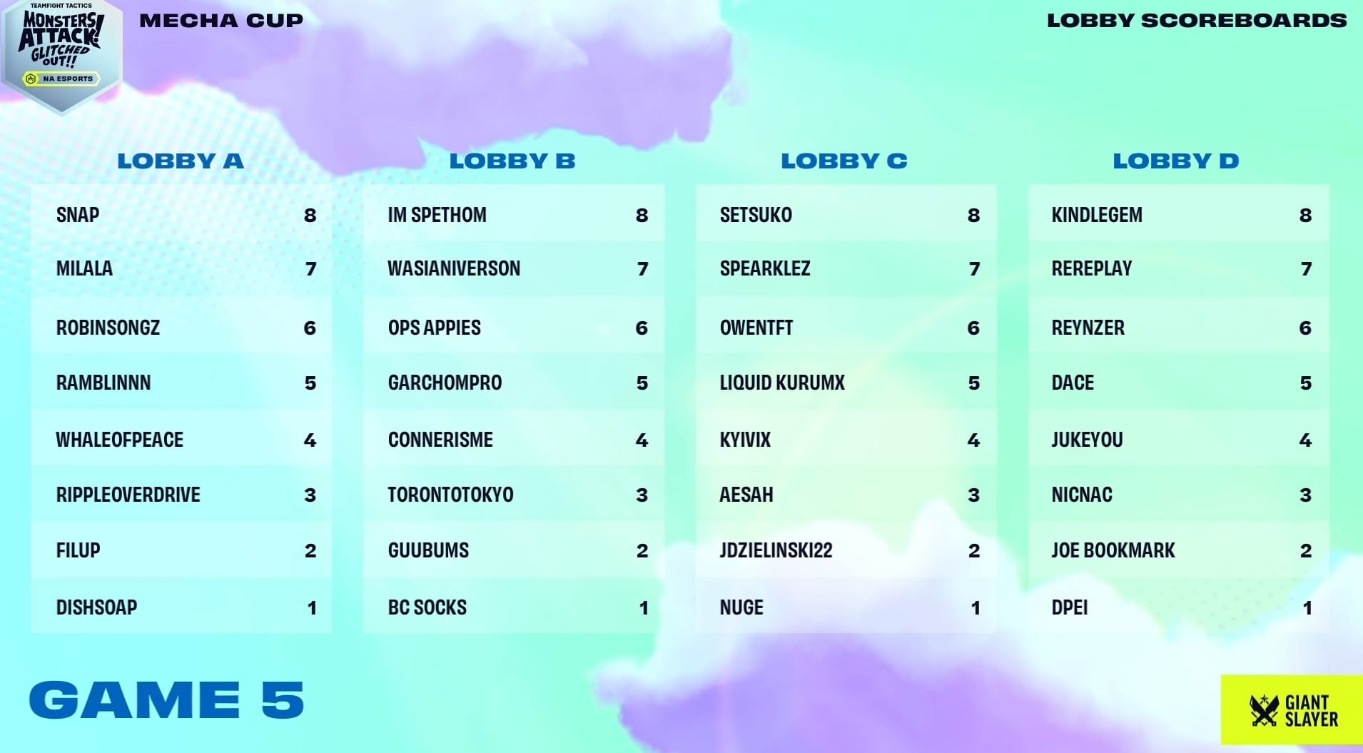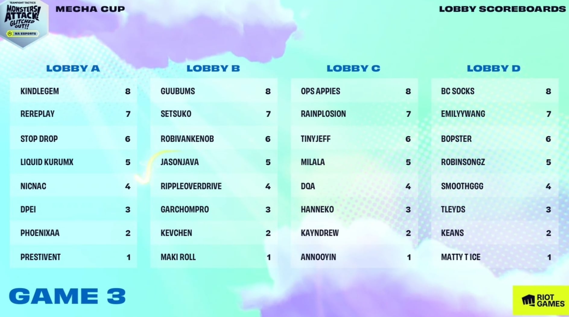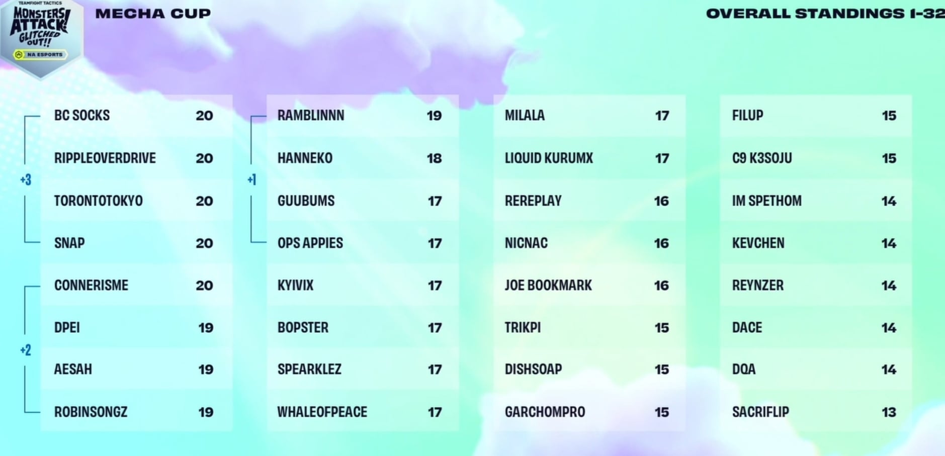 Heading into the final game on day three, it was Robinsongz, DPEI, RippleOverdrive, and BC Socks sitting in the top four at the NA Mecha Cup. Just missing the top 32 cut after six games played were C9 k3soju, DQA, and Emily Wang. Advancing to the third day was a healthy mix of veteran and new TFT faces.
