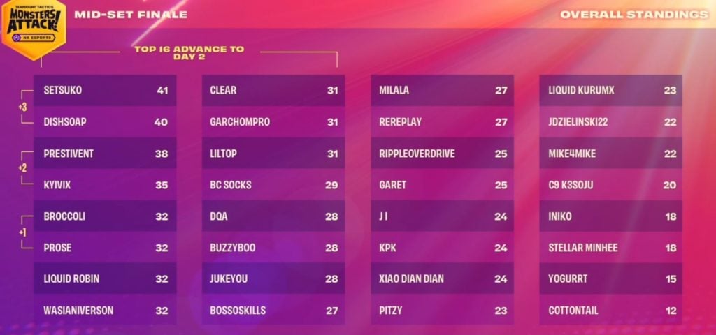 After six games, day one of the TFT Mid-Set Finale wrapped with sètsuko at the top of the leaderboard with 41 points. Dishsoap finished in second with 40 points, followed by Prestivent with 38 points and Kyivix with 35 points. All of the top six players earned bonus points that carried over into day two.