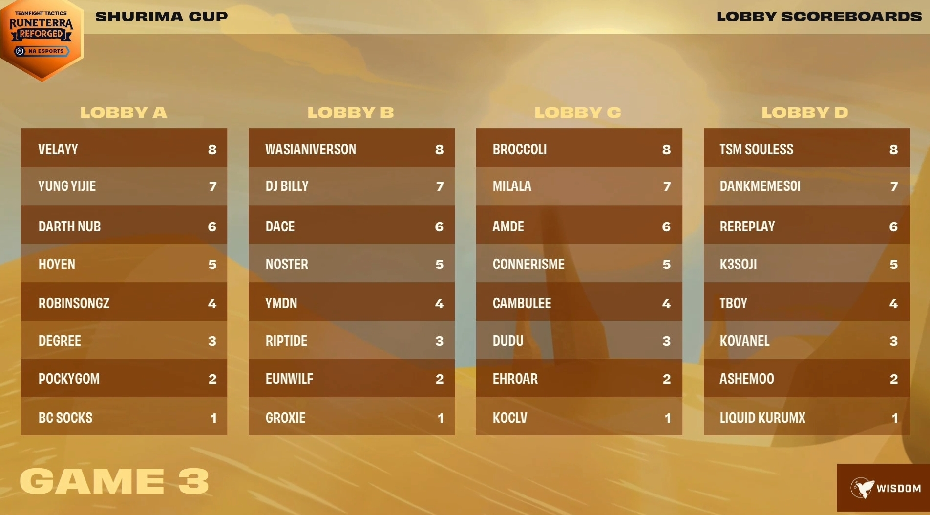 Day three of the NA Shurima Cup showcased the top 32 from days one and two, along with the top Ranked 32 players in TFT Set Nine. Players were split into eight lobbies, with lobbies rotating every two rounds.
