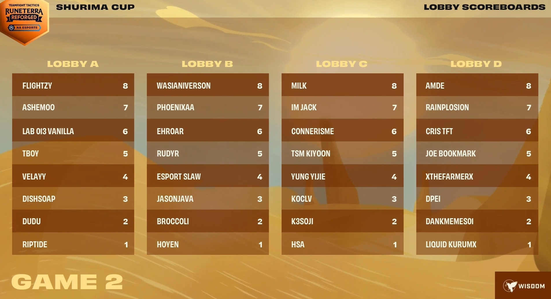 Wasianiverson slid into the top 16 with a game five win while sètsuko pushed toward a top eight spot with another lobby win during game five.