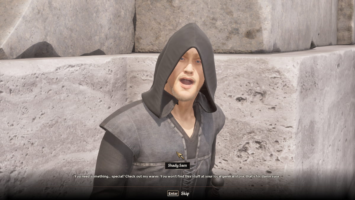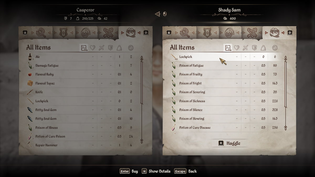 He sells 30 Lockpicks a day, and you can reset the day by sleeping on a bed or following the time on your map to return to him and purchase more. Apart from that, he also sells a myriad of potions, which are very useful to increase your health, attack, and many other attributes in the game. While he has a fixed price for these Lockpicks, you can press R to haggle and adjust the values of purchasing or selling items to him. If your prices are right, he’ll allow you to sell or purchase his item at a low price, but if you try to sell him your goods for an exorbitant price, he’ll refuse to buy them. You can increase your Mercantile skill to get better prices.